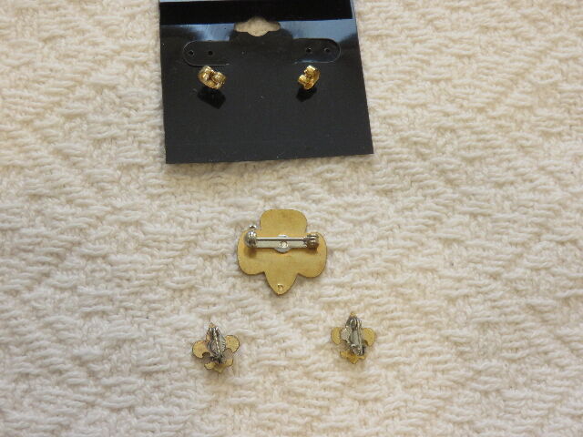 The main Gold Tone Clover Pin is from the early 1960's; the two smaller pins; which both are marked with "Patent # 2066969 under their clasps, are also from that time frame. The set of two earrings; which my girlfriend let me use one of her modern plastic earring holders to put them on to keep them from getting lost; is from the later 1960's.