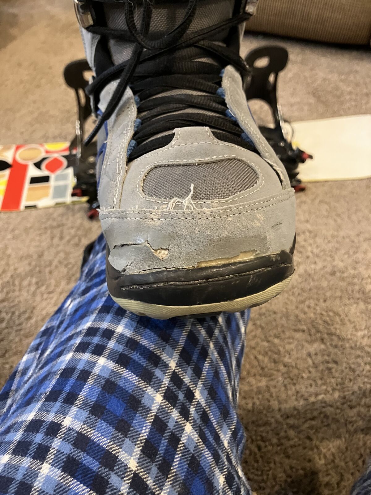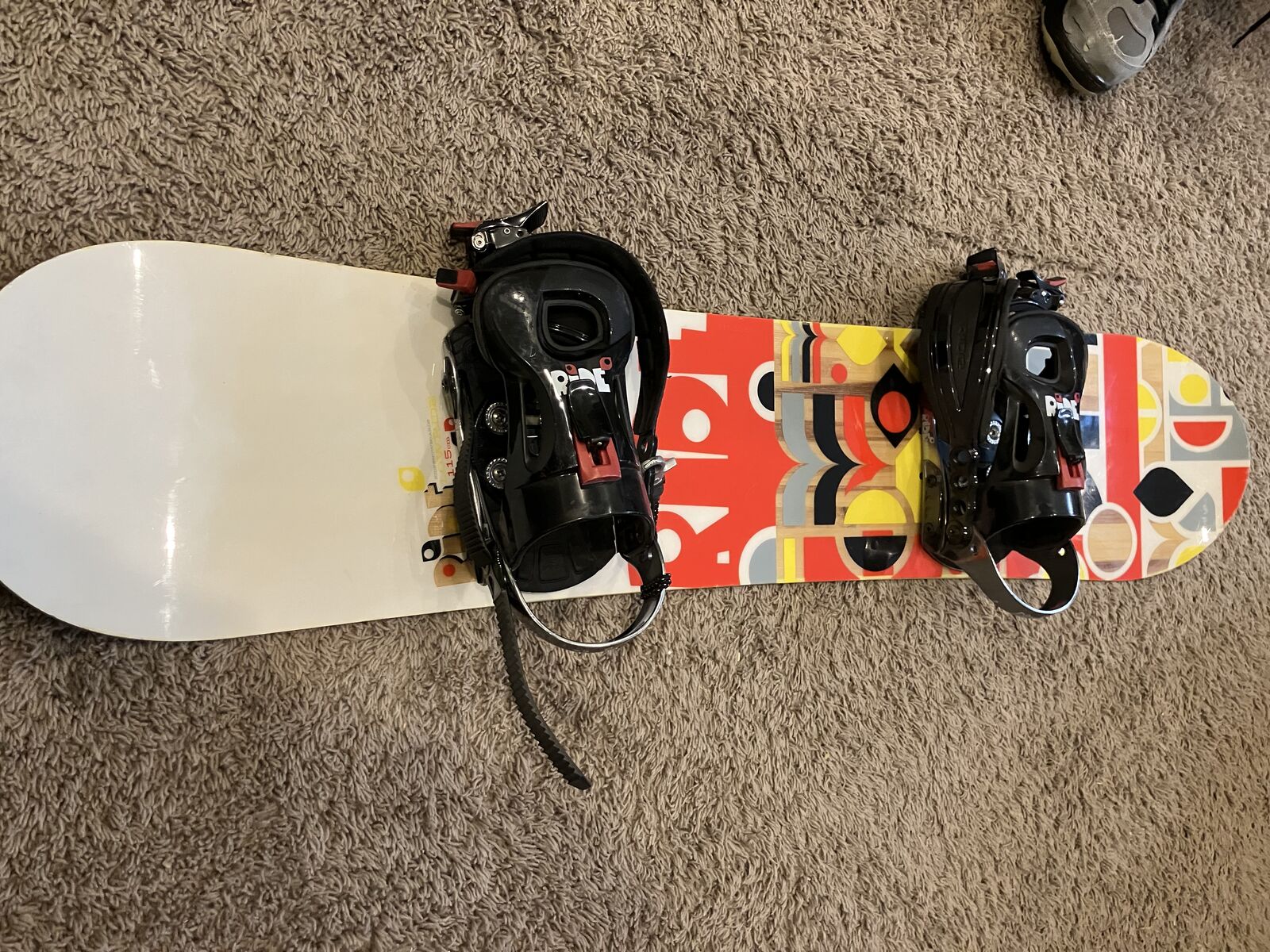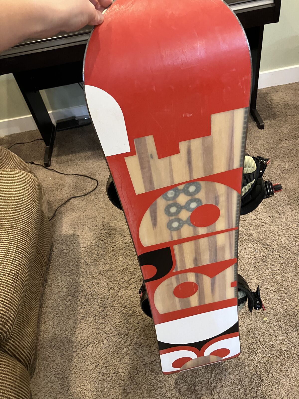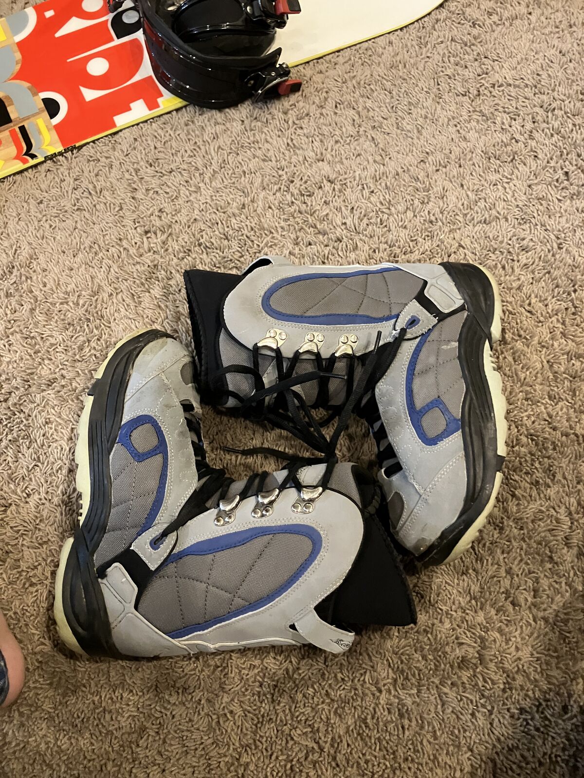 Venmosnowboard is in good condition with slight chips on the one end. Boots are men's size 5 1/2.
