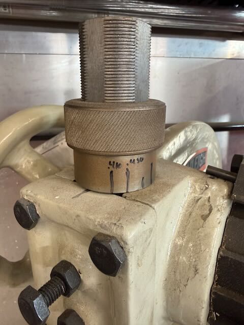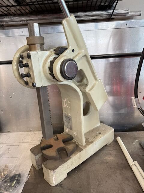 3-ton ratcheting arbor press customized for an adjustable depth stop. This was purchased and modified to press 1" wide strap for a product. Less than 150 parts bent before no longer needed and has been hanging out on the work bench for a few years now.