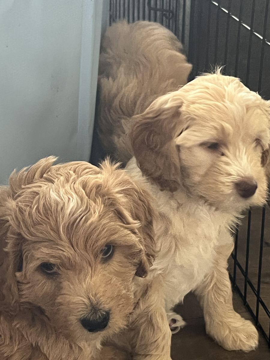 Mom - Mini goldendoodle 16lbs (white) Dad - Bernedoodle 35lbs (multi-colored) Puppies are Mini Golden Mountian Doodles. 2 girls 1 boy