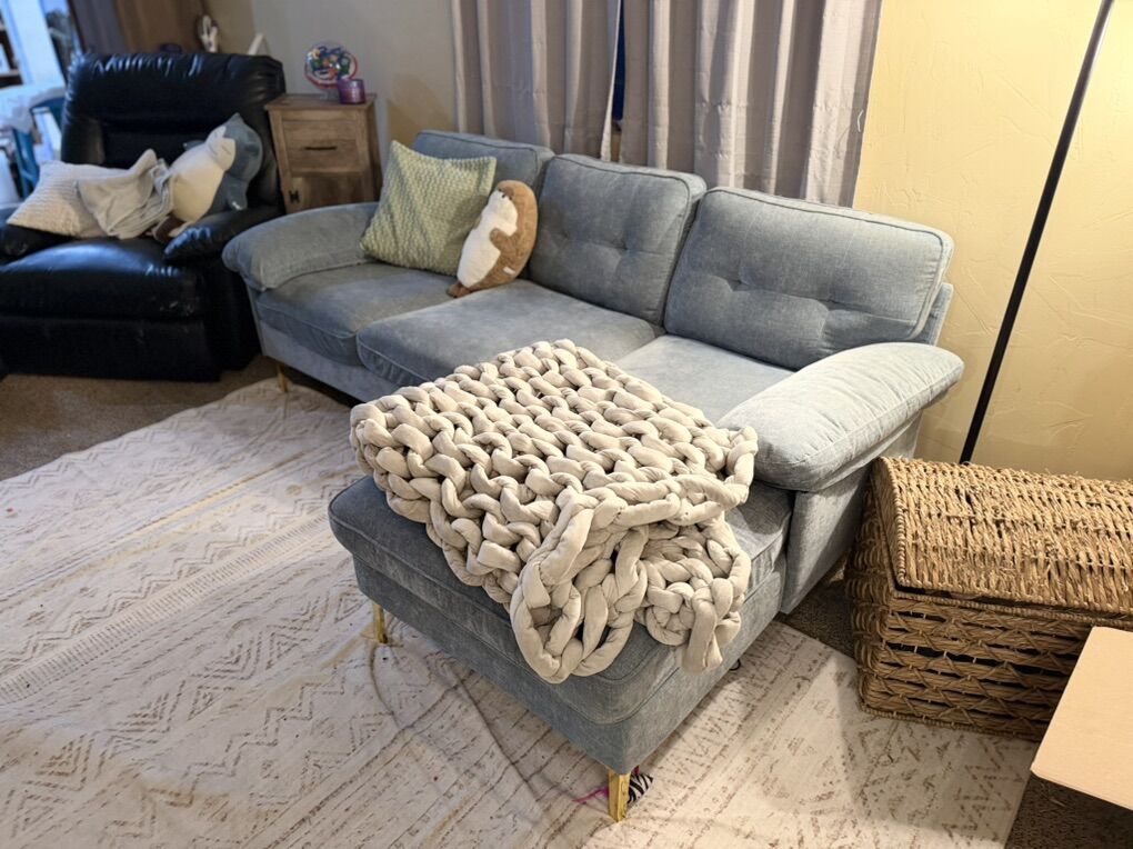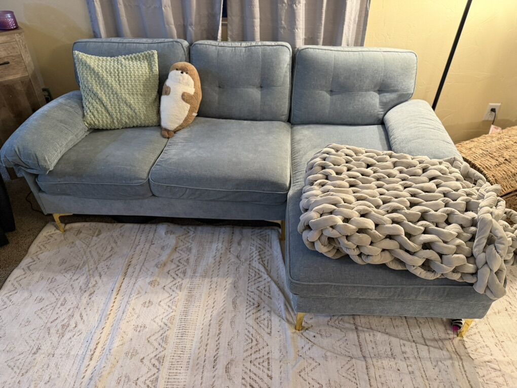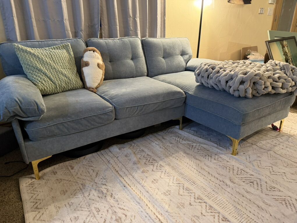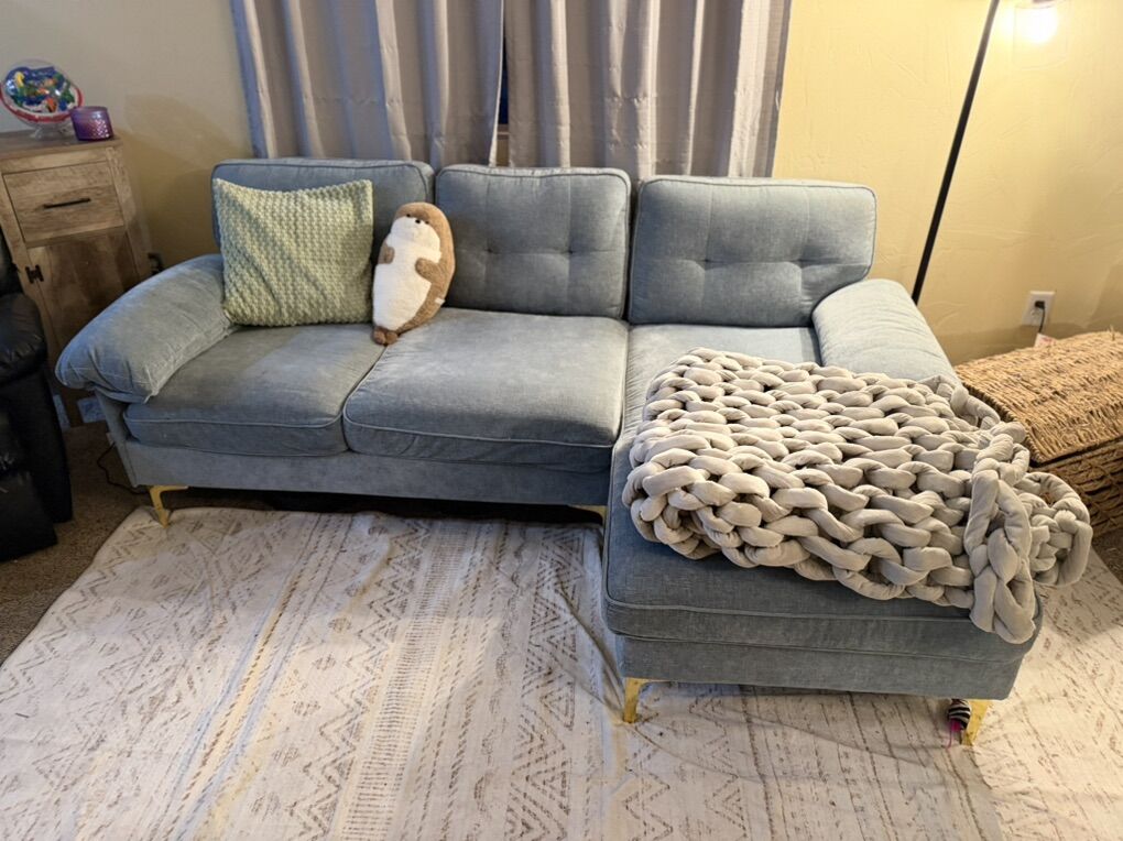 VenmoComfortable sky blue velvet sectional. Family is growing, we are getting a bigger one. Ask price or best offer, it does need to go.