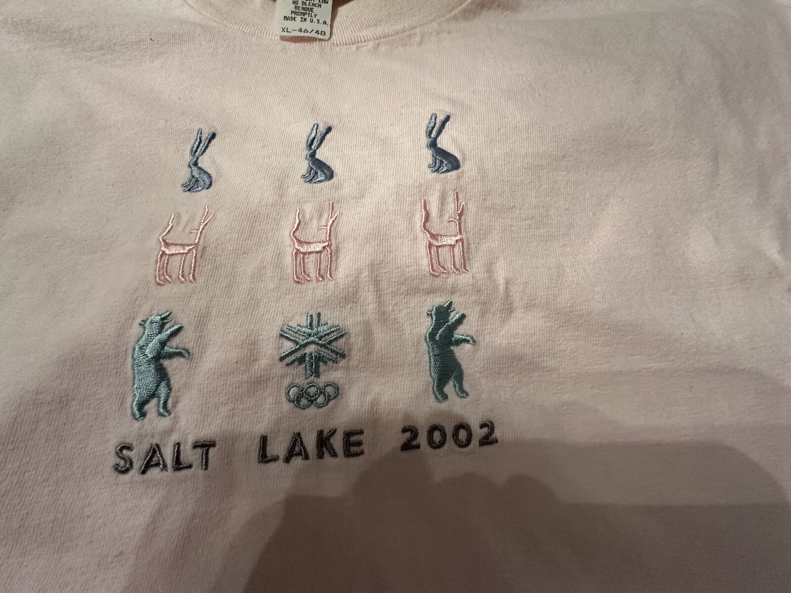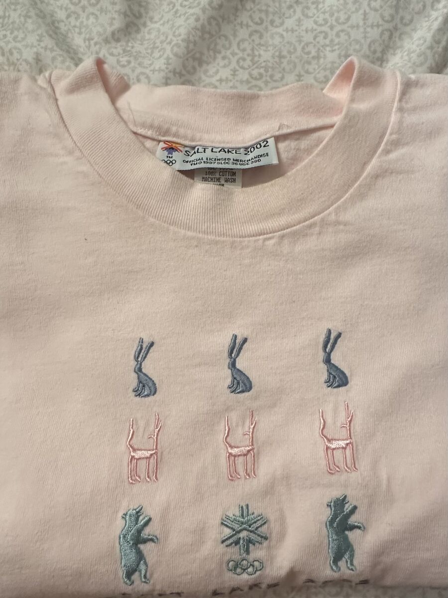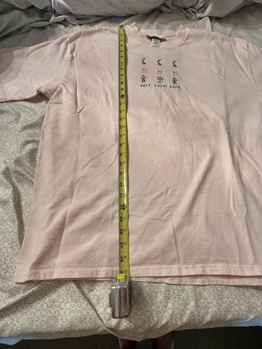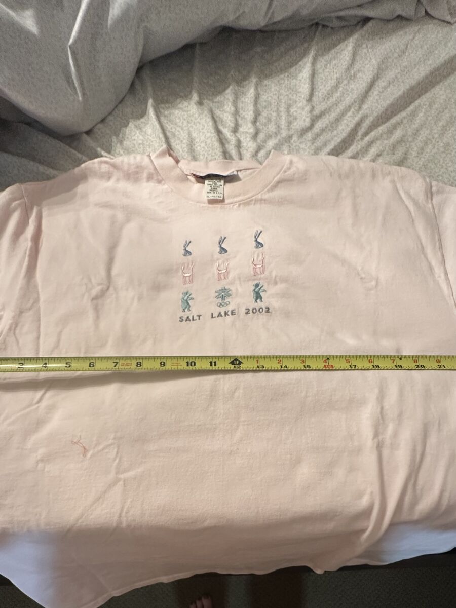 New Without Tags Rare Vintage Salt Lake City 2002 Winter Olympics Pink Tee Shirt. Size is XL 46/48. The Olympic embroidered mascots are on the front. Standard 46/48 size; the sizing matches most men's size T-shirts. See pictures for exact measurements. 23" pit to pit, 29" neckline to bottom hem. This was purchased new in 2002 and never worn. Stored in a sealed Rubbermaid container, in a clean, smoke-free home since purchased. Officially licensed on the neckline tag. 100% Cotton, machine washable.