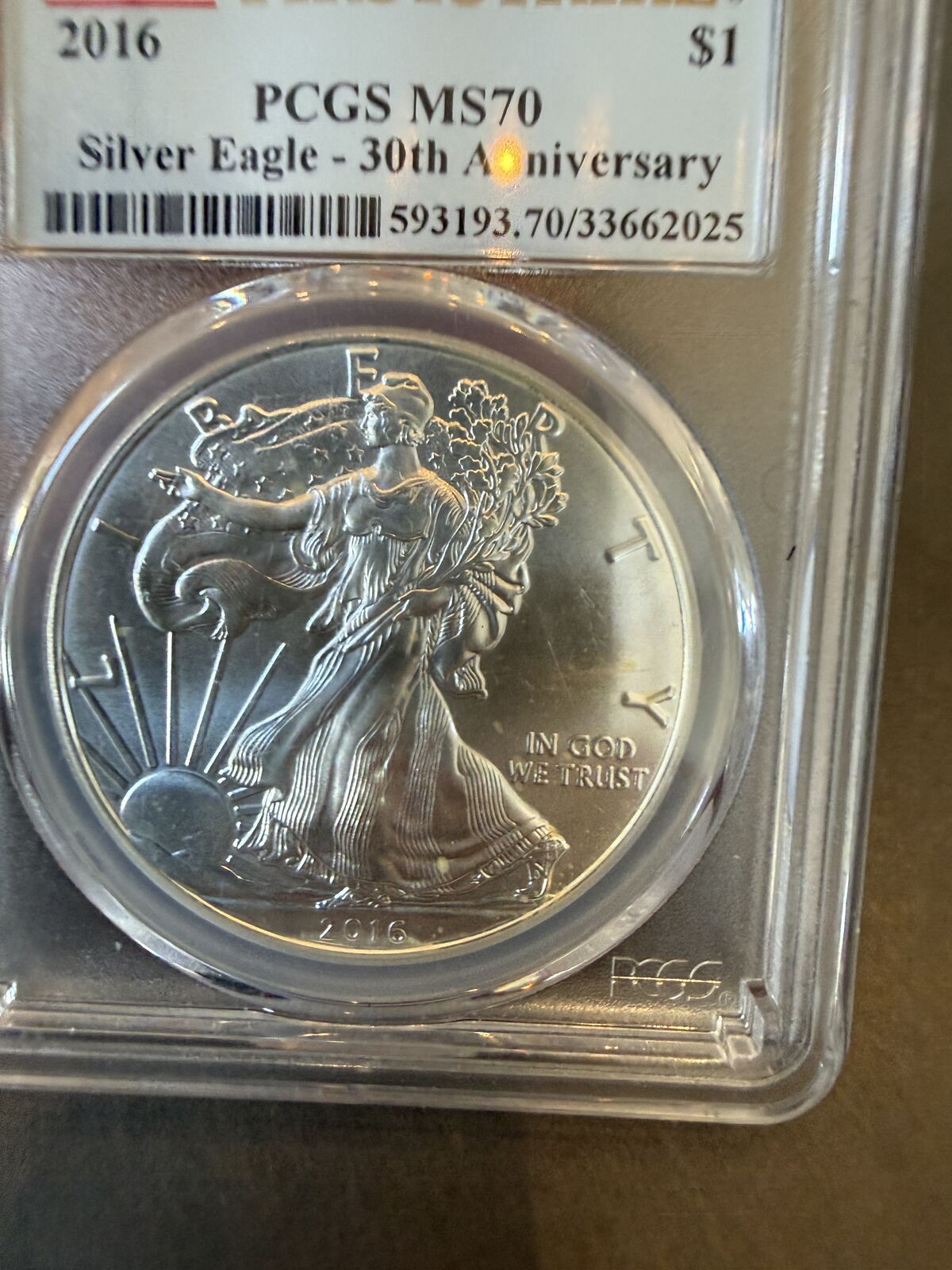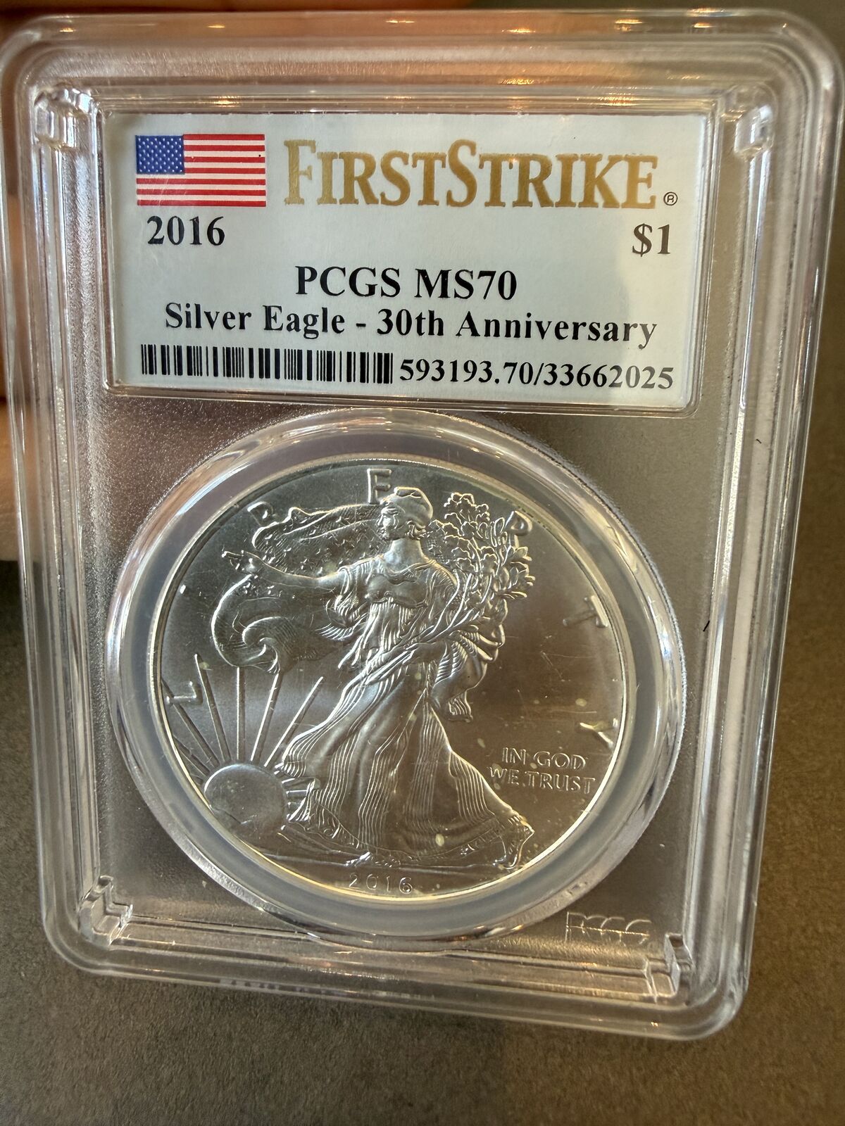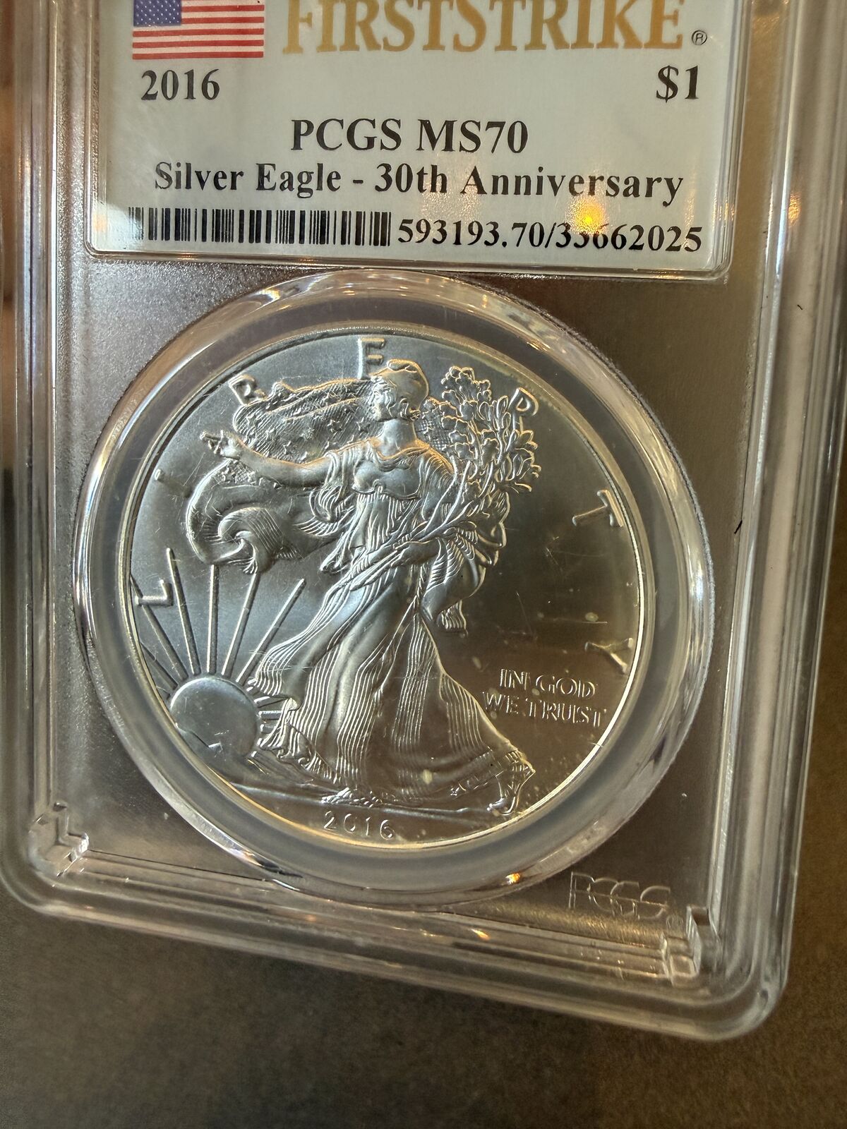 2016 $1 SILVER EAGLE PCGS MS70 FIRST STRIKE–30TH ANNIVERSARY 2016 $1 Silver Eagle FirstStrike Graded PCGS MS70 30th Anniversary Composition1 Troy oz. Pure Silver