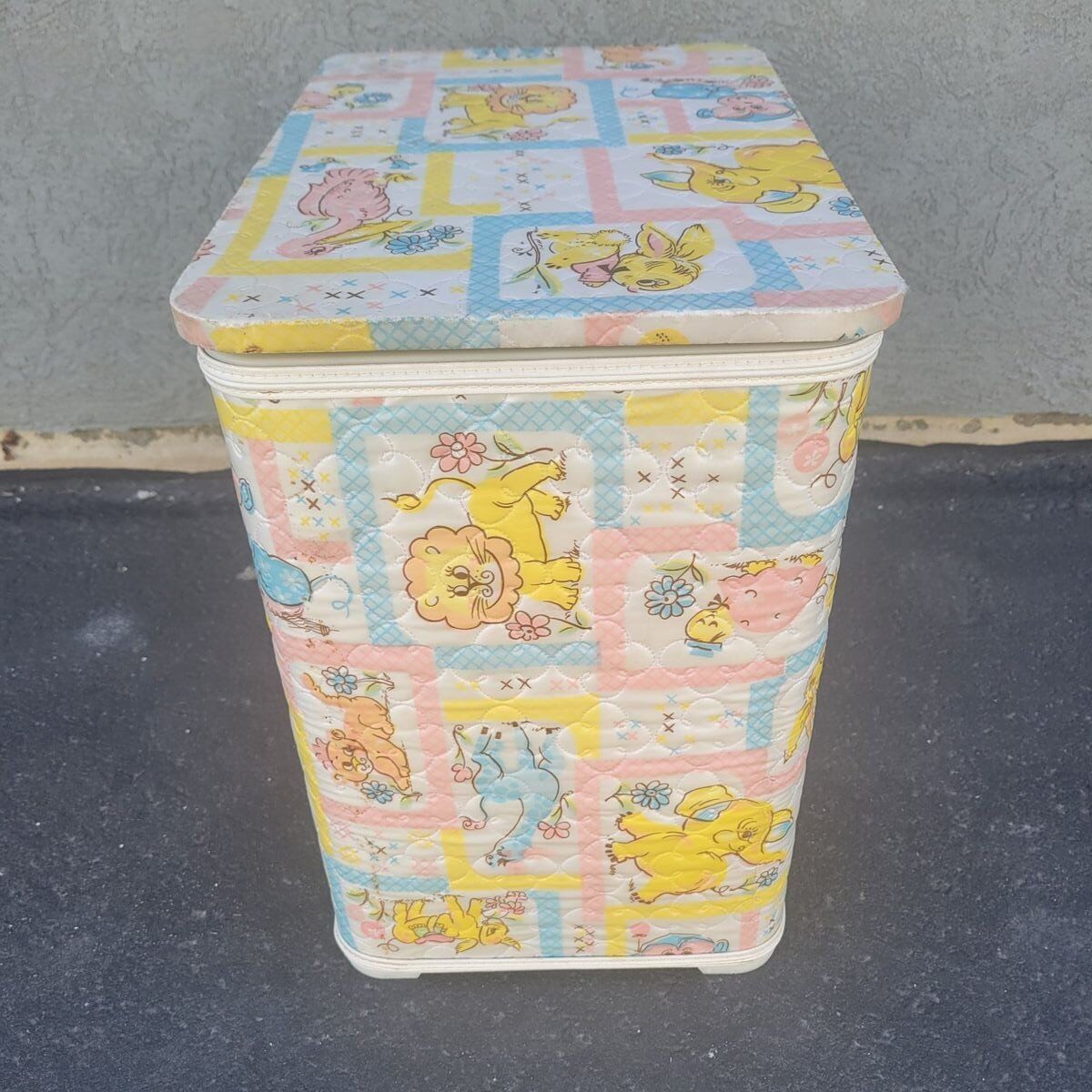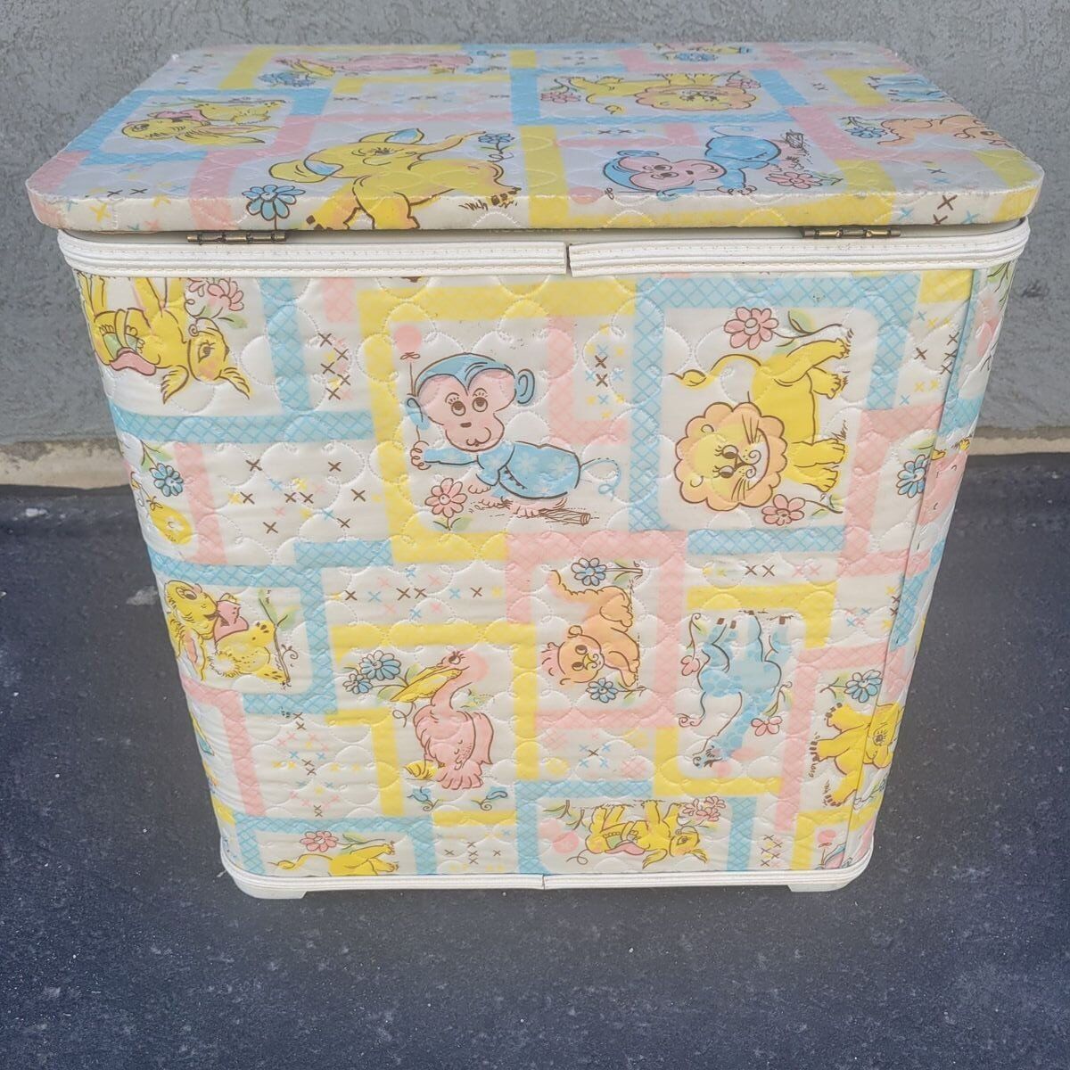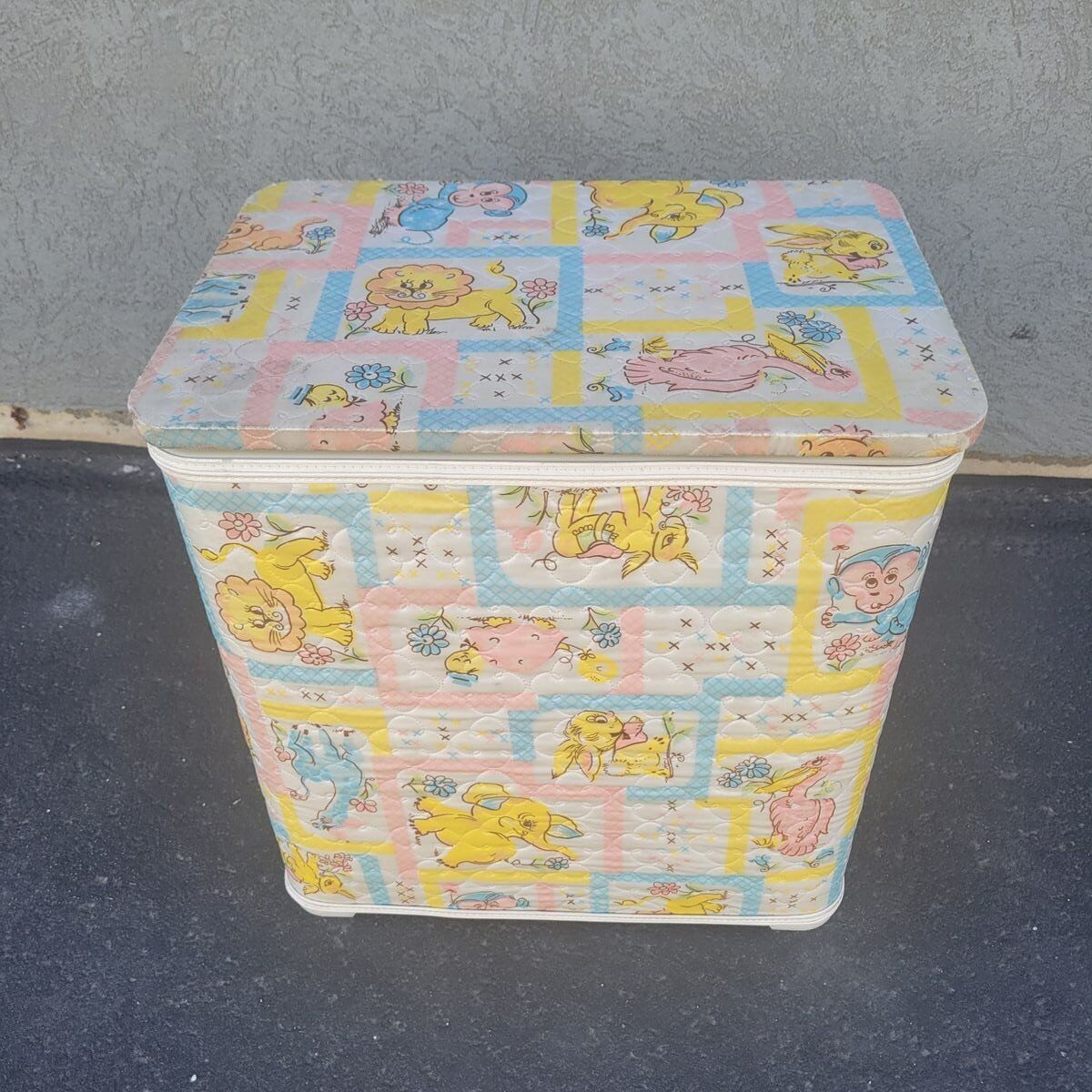 Sweet vintage baby nursery hamper with a soft quilted patchwork animal print in pastel colors. Features charming elephants, lions, monkeys, and birds in a classic retro nursery style. This is a lightweight nursery hamper with a hinged lid, perfect for baby storage, nursery organization, or children’s room decor. Great for storing baby items, blankets, soft toys, diapers, or keepsakes. The interior is clean and the lid opens smoothly. This is built to last! A lovely piece for anyone decorating a vintage-inspired nursery, cottagecore baby room, retro kids space, or nostalgic children’s bedroom. Easy to wipe clean exterior.