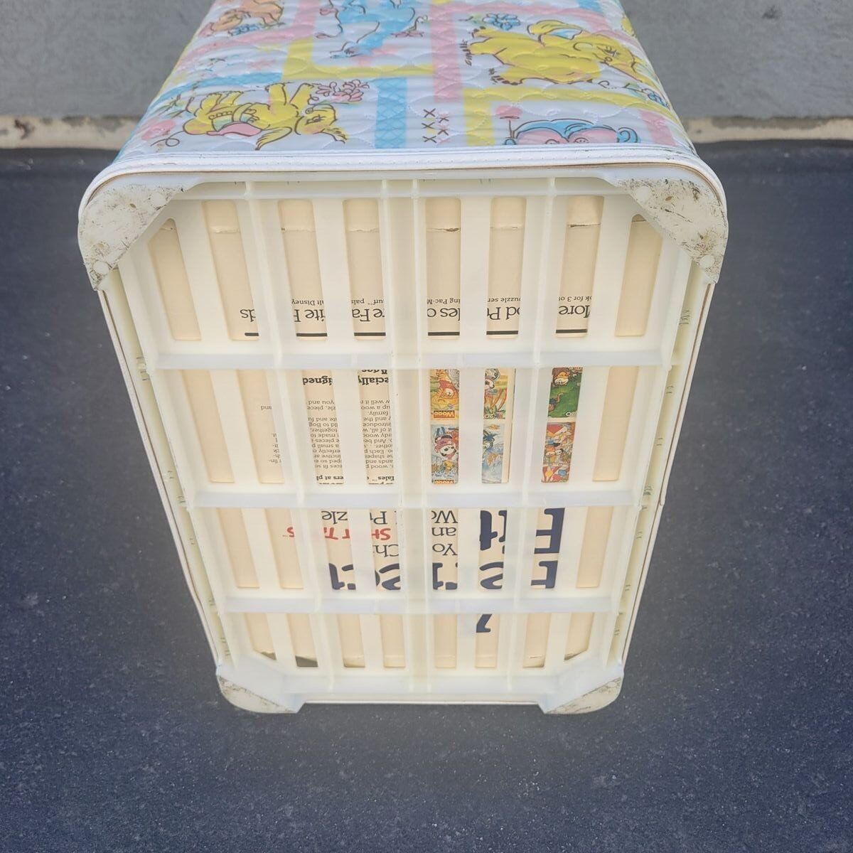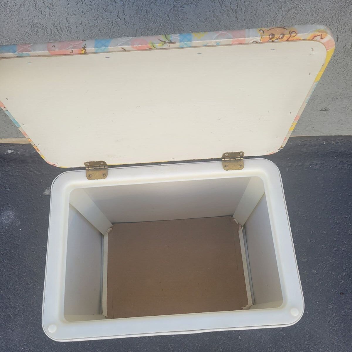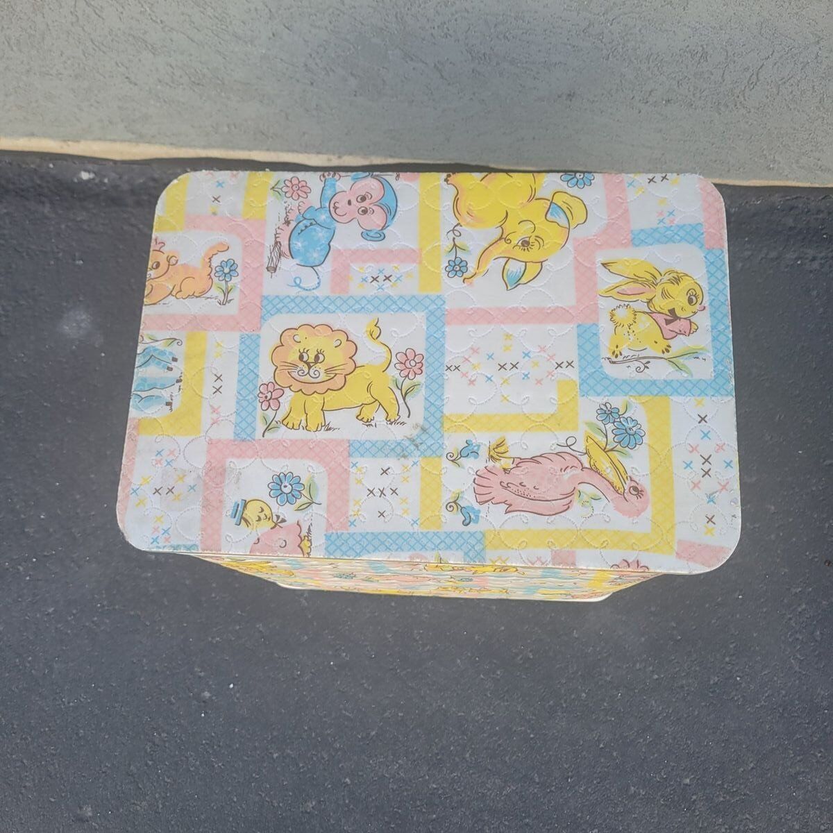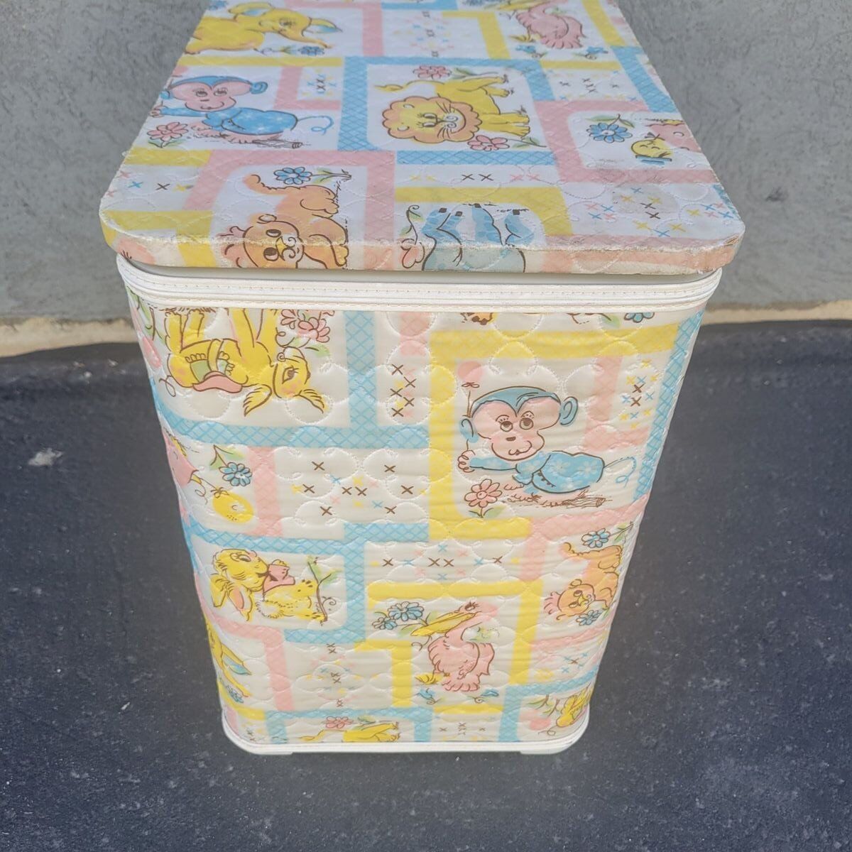 Sweet vintage baby nursery hamper with a soft quilted patchwork animal print in pastel colors. Features charming elephants, lions, monkeys, and birds in a classic retro nursery style. This is a lightweight nursery hamper with a hinged lid, perfect for baby storage, nursery organization, or children’s room decor. Great for storing baby items, blankets, soft toys, diapers, or keepsakes. The interior is clean and the lid opens smoothly. This is built to last! A lovely piece for anyone decorating a vintage-inspired nursery, cottagecore baby room, retro kids space, or nostalgic children’s bedroom. Easy to wipe clean exterior.