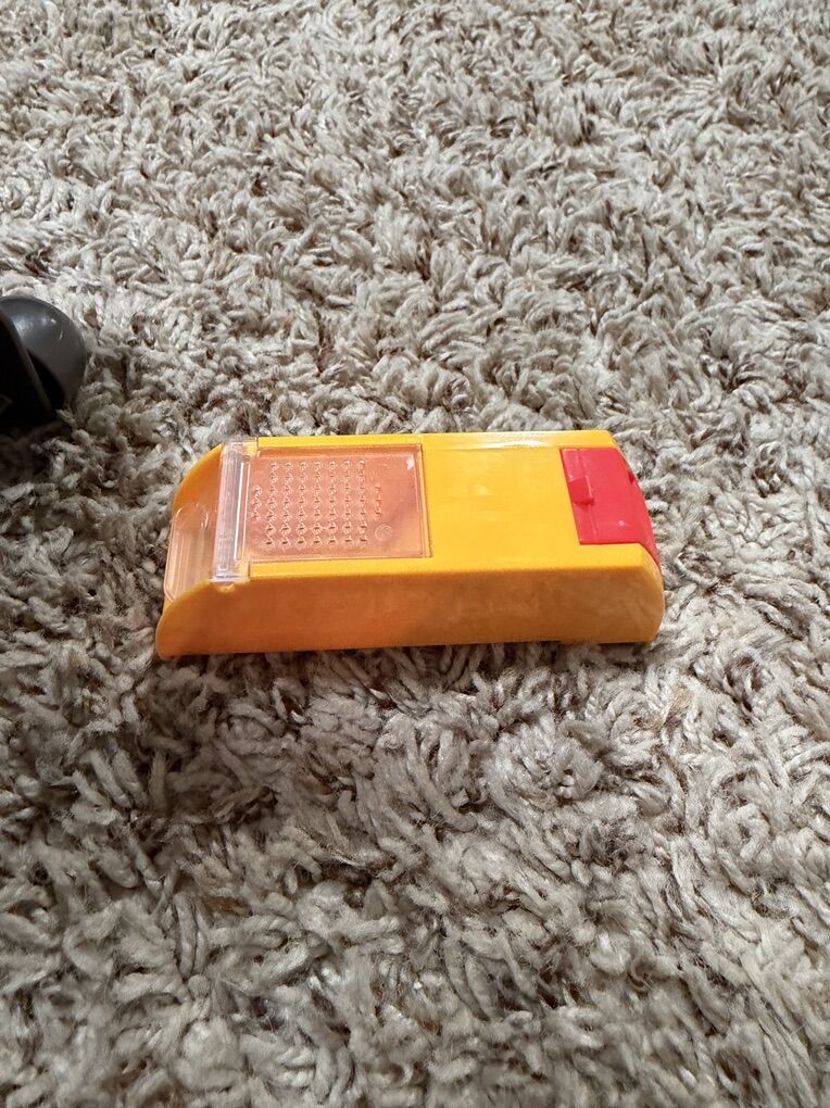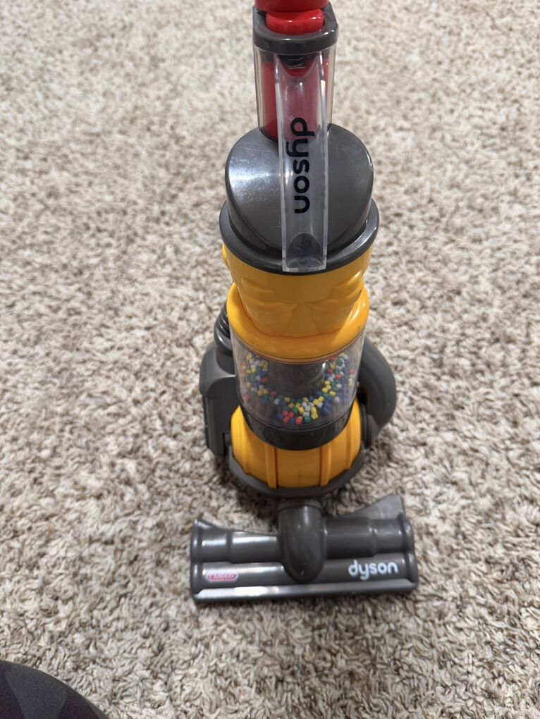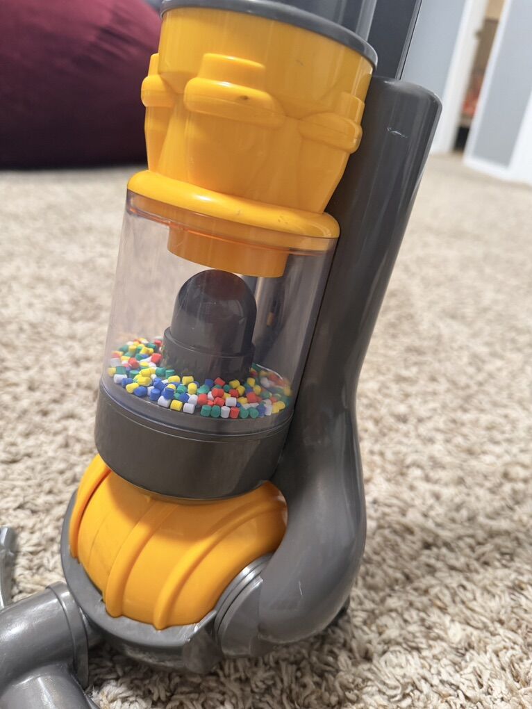 VenmoKids Dyson play vacuum. It takes 4 C batteries and will really suck up little pieces here and there on the floor! It has a little compartment that you can remove in back and empty out the little things that get sucked up. My kids loved playing with this, but have outgrown it.