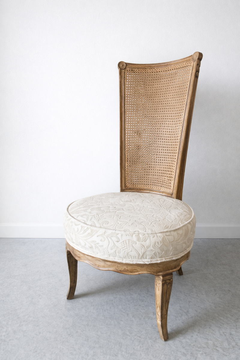 Vintage French-Style cane-back dinning chair with a round white upholstered seat