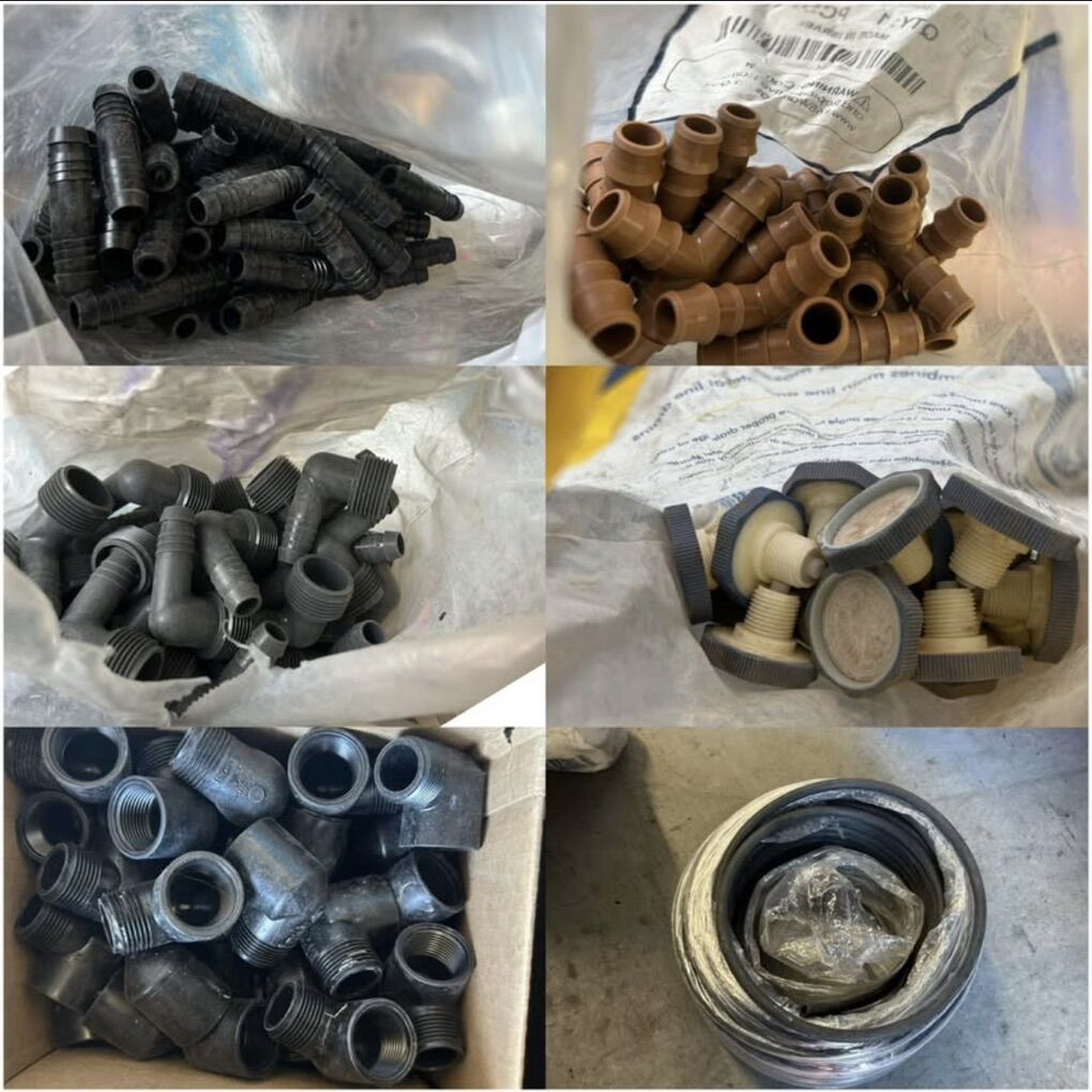 What’s included: • heavy-duty shovels (round, square, trenching, scoop) • Rakes (leaf, bow, aluminum grading) + hoes, picks, broom • Werner fiberglass step ladder • Scotts push spreader + traffic cone • Rubbermaid Brute bin (with roll of landscape fabric) • Contractor-grade hose w/ brass fittings • Empire level, speed squares, chalk lines, flags, staples • Pipe wrenches, pliers, cutters, knives, hammers, mallets, chisels • PEX crimper & fittings • Organizer full of sprinkler nozzles (Rain Bird) • Lot of PVC fittings (tees, elbows, couplings, check valves) • Elbows, barbed fitting, caps, adapters, risers • Drip tubing roll + buckets of PVC pipe & squared steel pipes for screeding • PVC cement, primer, sealants, DryConn waterproof connectors • 2 6 ton jack stands