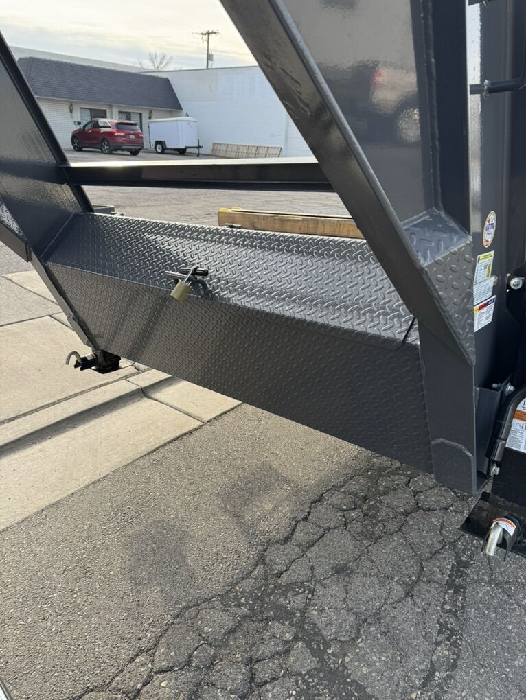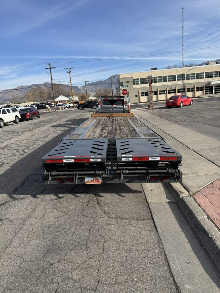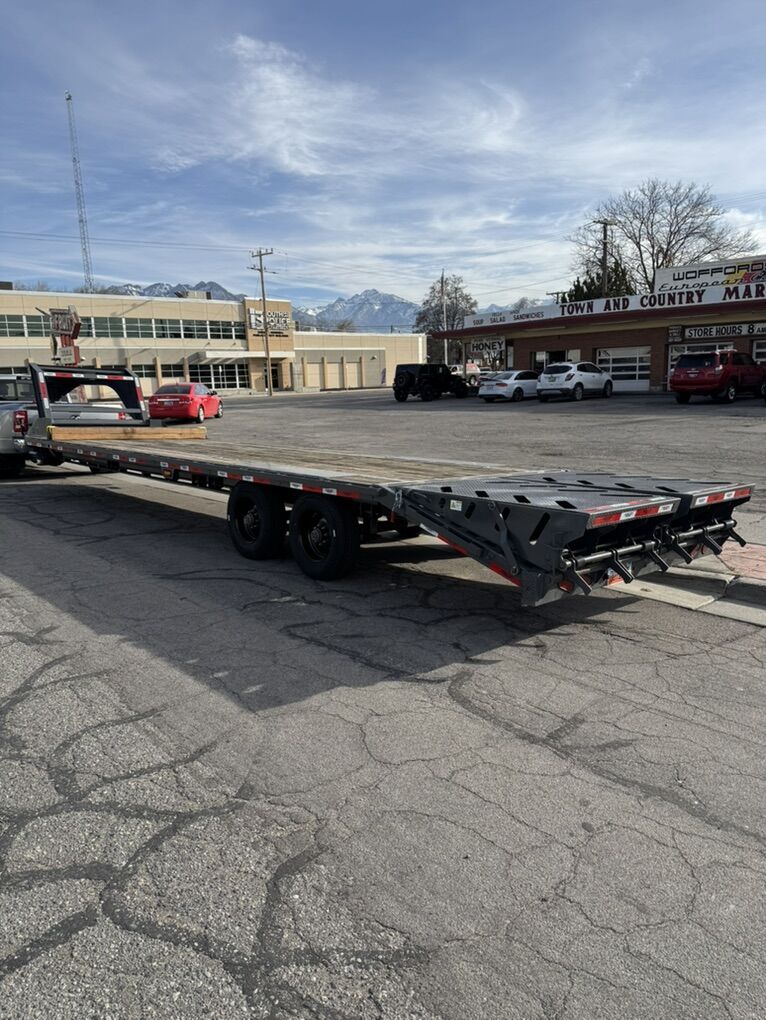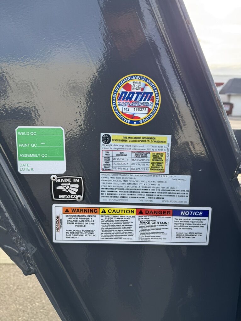 Zelle2023 horizon ftz 32’ gooseneck 8.5’ wide 32’ deck with 5’ mountain ramps 33” deck height 12” I beam channel 3” cross c channel Torque tube Tool box Built in channel with x6 strap winches for 4”straps 16,264 lb payload Gvwr 24,999 lbs. standard 2-5/16 receiver Led lighting throughout, down side rails and signals X2 10k Dexter oil bath axels with lippert electric brakes 6-leaf slipper springs suspension 18 ply st235/75R 17.5 tires