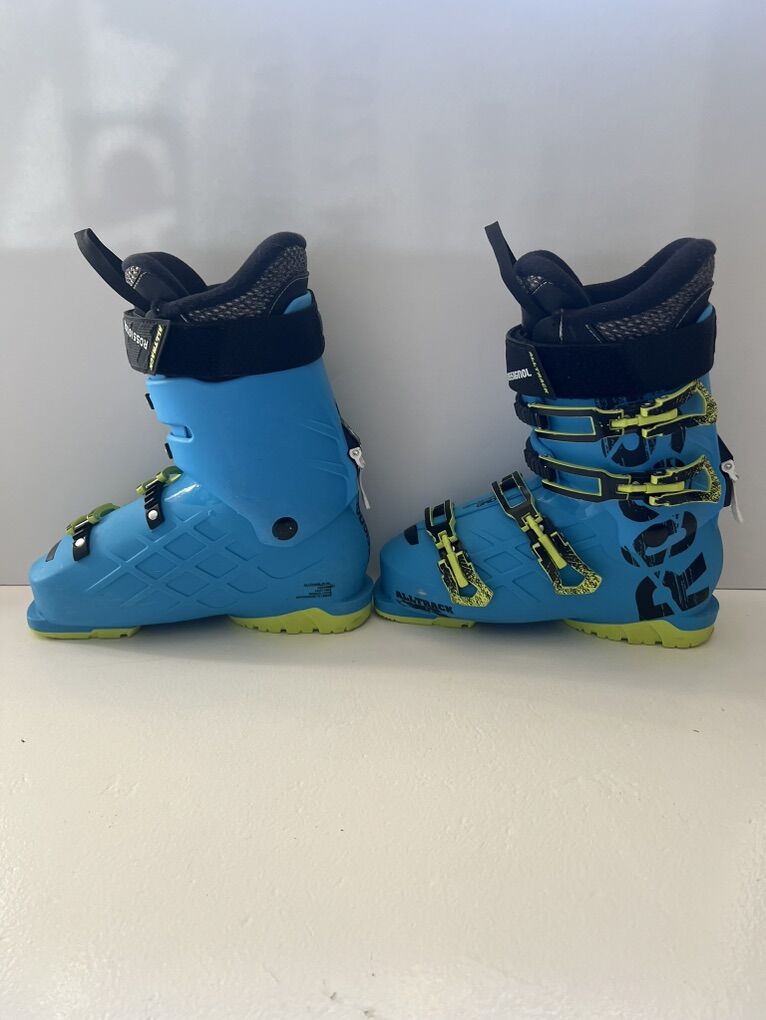 Blue, yellow ski boots Amazing boots, skied on them for multiple years than grew out of them Perfect condition, comfortable and great performance.