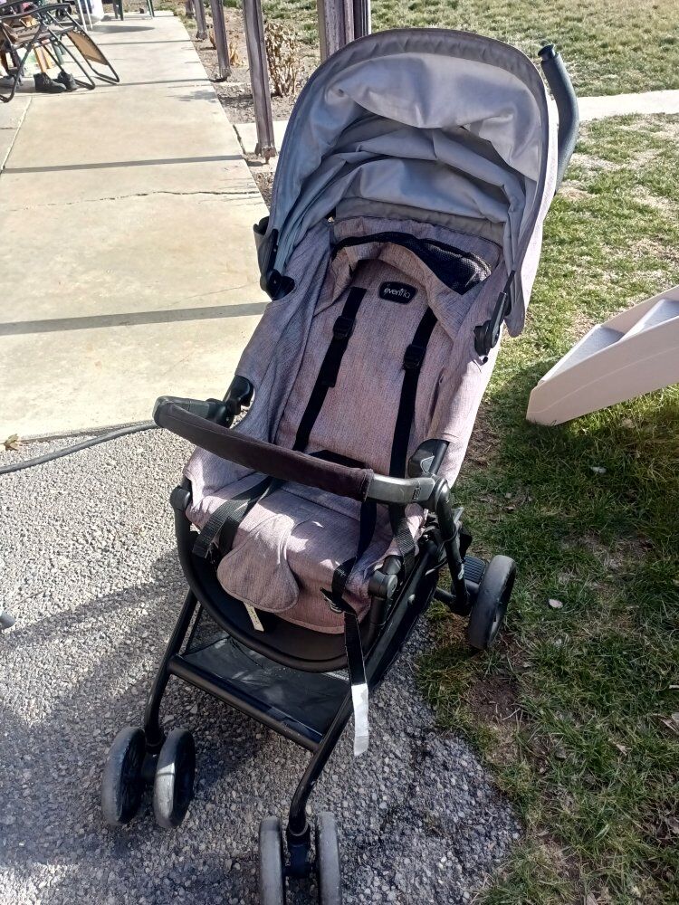 PayPalHandy Evenflo stroller for sale. It has a greyish purple fabric and black frame. Comes with a canopy, full harness, storage basket underneath, and a cup holder. Super easy to push around.