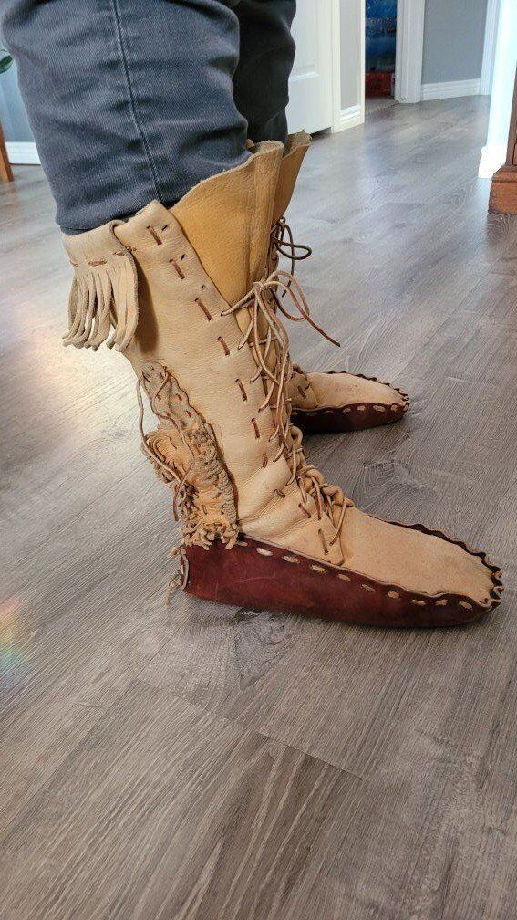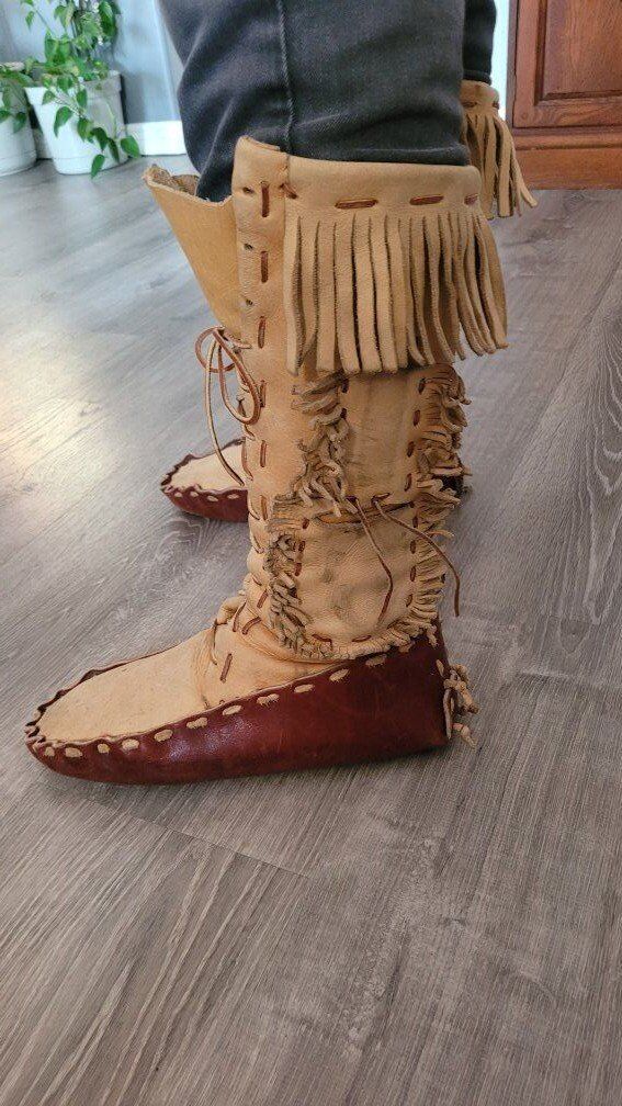 These Mt Man elk skin leather boots are a size 12. They were built for deer and Elk, hunting. . It's a lot quieter than a traditional shoe and you can get a lot closer. You don't get the brush noise or the crunching of the leaves under thy feet. The asking price is $135.00 cash only.