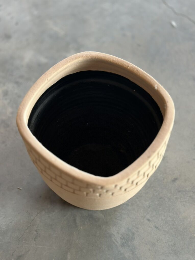 DESCRIPTION: Modern matte ceramic planter with a unique brick textured rim. Features a natural unglazed cream exterior and a sleek black-glazed interior. Perfect for modern, boho, or minimalist decor.