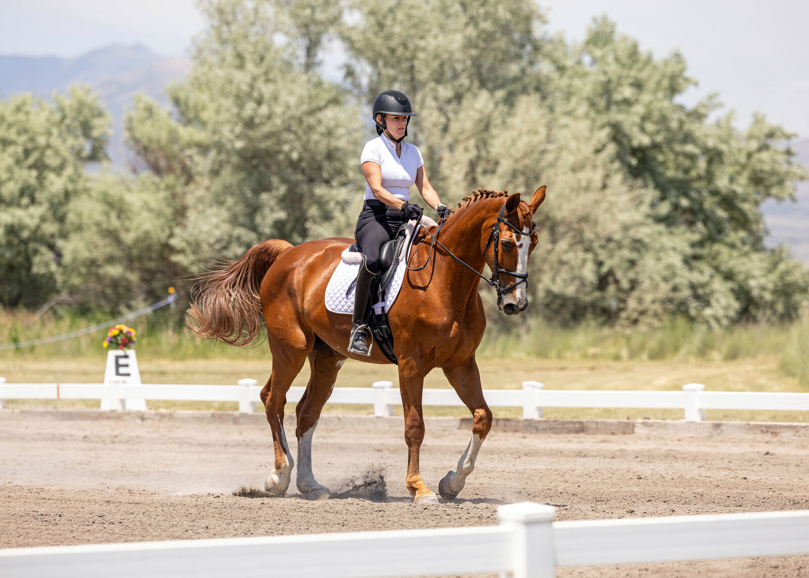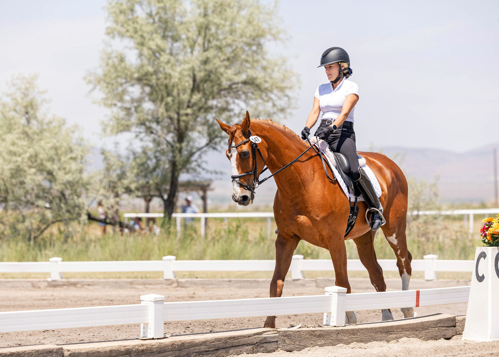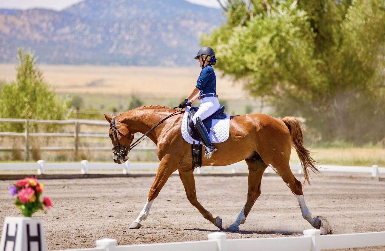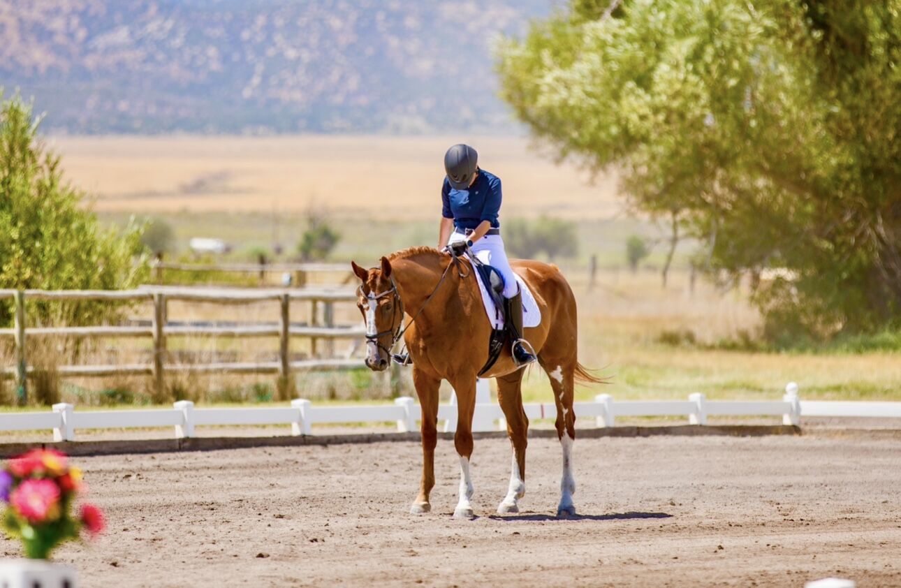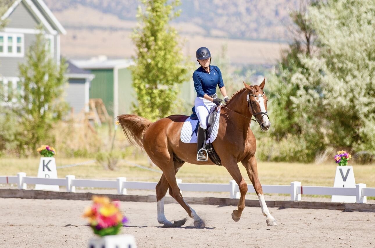 Showed Dressage through 4th Level. Confirmed flying changes. He has a classic schoolmaster brain — patient, forgiving, and incredibly well‑educated. I've ridden him in windstorms with no problem. I've ridden him when other horses are galloping in the field next to us, and it didn't phase him. He's great on trails.