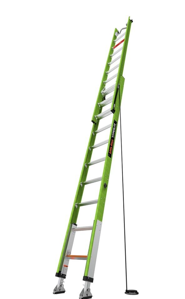 LIGHTWEIGHT - More speed, less fatigue. We made the Hyperlite out of lightweight fiberglass so you can move your ladder with ease. SPIKE FEET - Spike feet add extra stability on job sites and can be used in either the pad or spike foot position. FLAT COMFORT RUNGS - Minimize foot fatigue. The HyperLite's flat rungs increase comfort while working on the ladder. NON-CONDUCTIVE FIBERGLASS - It's truly a ladder built for the trades. Made from lightweight, durable fiberglass, you can confidently work around electricity without fear of conductivity. DOUBLE-PULLEY SYSTEM - Keep your feet free. The ladder's pulley was moved to the side for safety, and its double-pulleys make operation simple. Getting enough leverage to raise the ladder is fast and easy. Ground Cue™ is an audible and tactile signal to let you know you when you have reached the bottom step of the ladder. Side mounted Climbing Angle Bubble Level to ensure proper ladder angle. V-Rung Corner Pad grips outside corners, walls, and studs in the extension position. Ratchet™ Leg Levelers - The integrated Ratchet™ leg levelers seamlessly solve the problem of using a ladder on uneven terrain. If you are setting up a ladder on a spot where the ground is slanted, causing the ladder to lean or wobble, simply extend the Ratchet leg levelers to meet the ground. You will get your work done faster and safer.