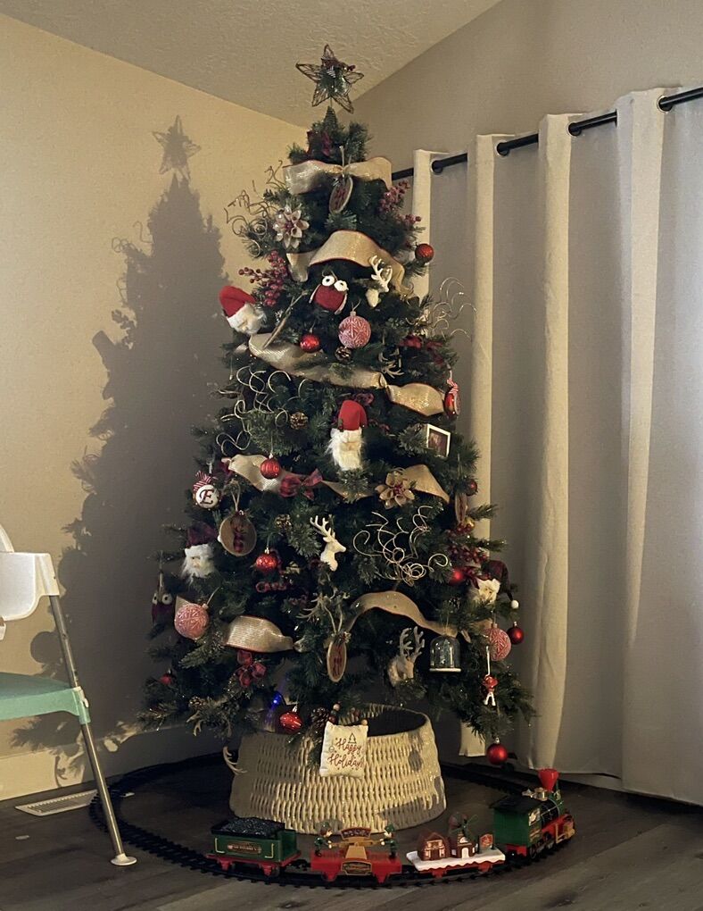 Prelit 400 LED Clear Lights, Carson Pine Artificial Christmas Tree, 7.5' - gold glitter and pine cones. All the lights still work. Retails for $300