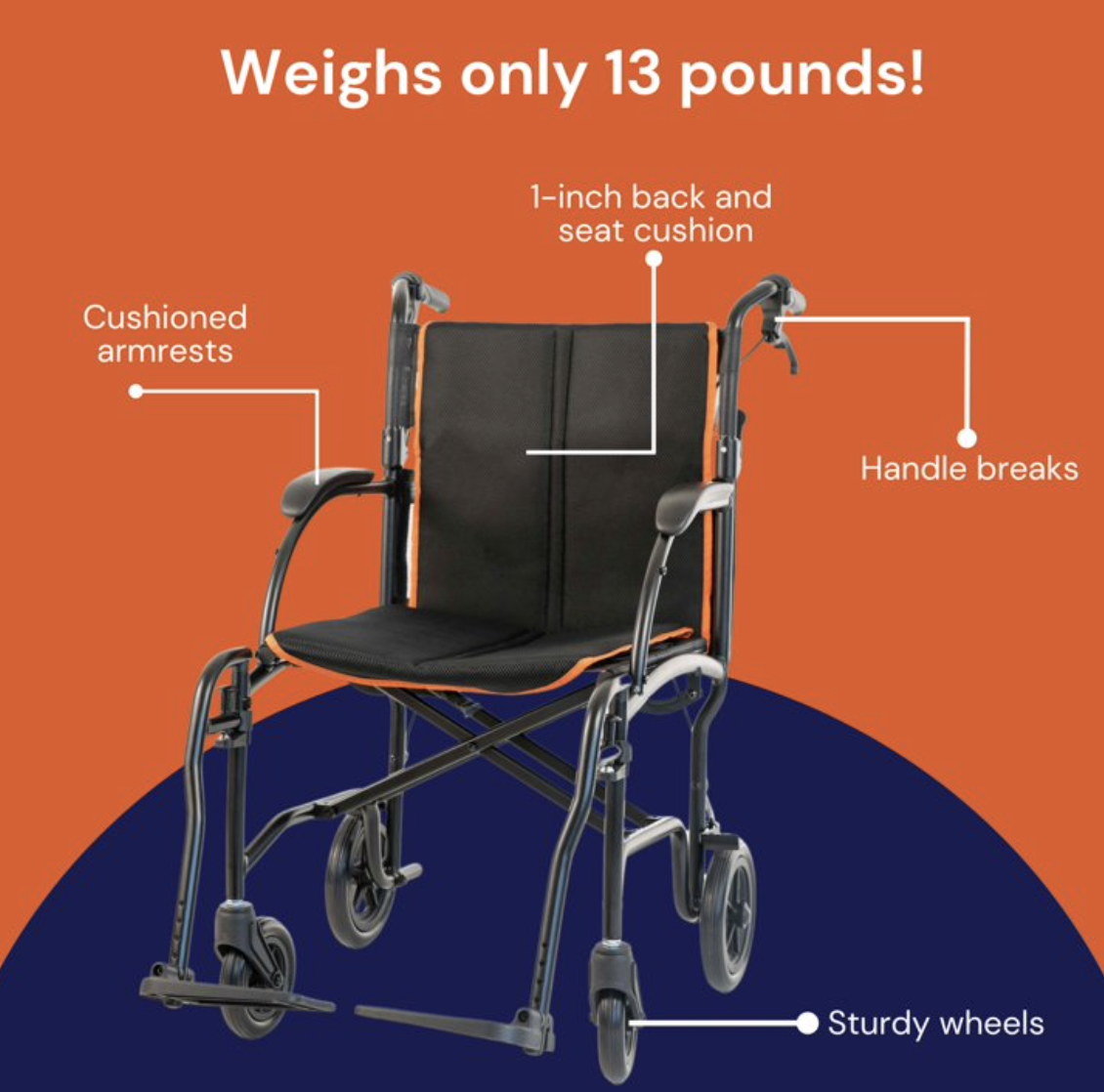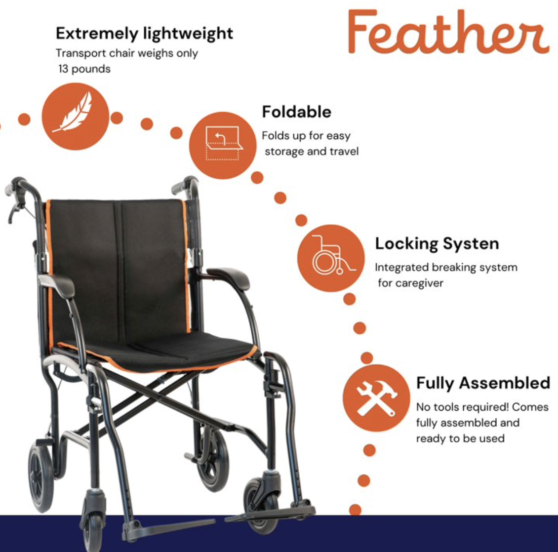 The Featherweight transport wheelchair is the lightest transport chair ever created! Transporting individuals has never been easier thanks to this lightweight, 13-pound chair. It's designed with brand-new materials that are easy for the user to propel and push. The lightweight frame is easy to lift in and out of a car, SUV, truck, or plane. This portable, travel wheelchair folds into one piece for easy storage. The lightweight transport chair is a great choice for men or women weighing less than 300 pounds. Take this chair anywhere! It comes fully assembled and ready to use.
