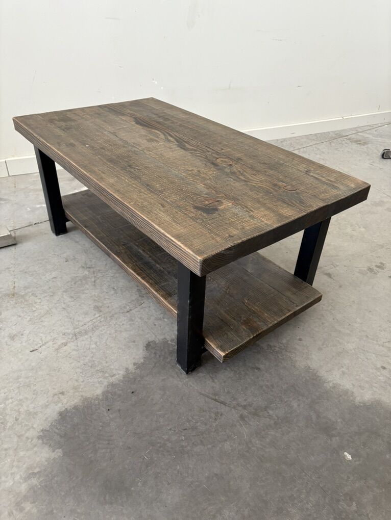 Solid wood coffee table with metal legs. Clean, sturdy, and in good condition. Rustic modern style.