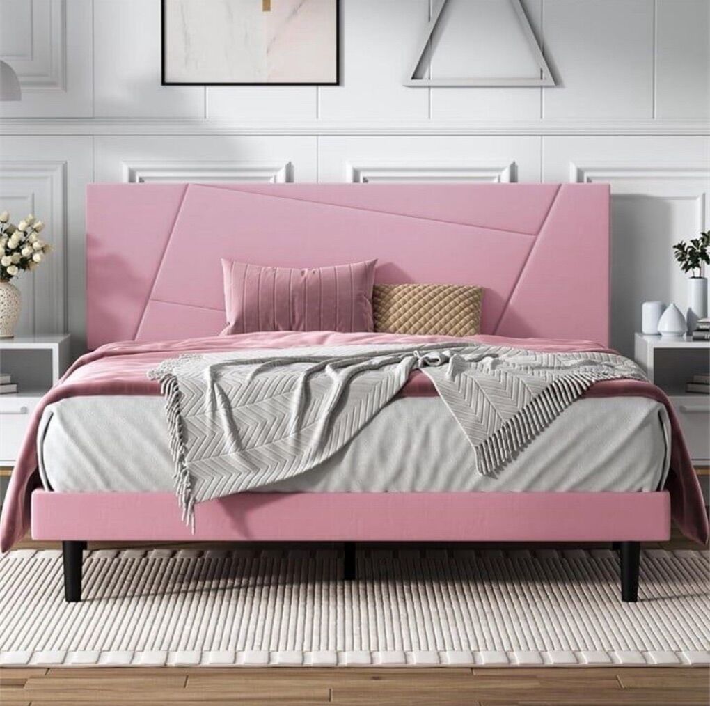 VenmoBrand New in the Box Queen Size Bed Frame Platform with Velvet Upholstered Headboard, Geometric, Sturdy Frame and Wooden Slats, Noiseless, No Box Spring Required, Easy to Assemble, Pink