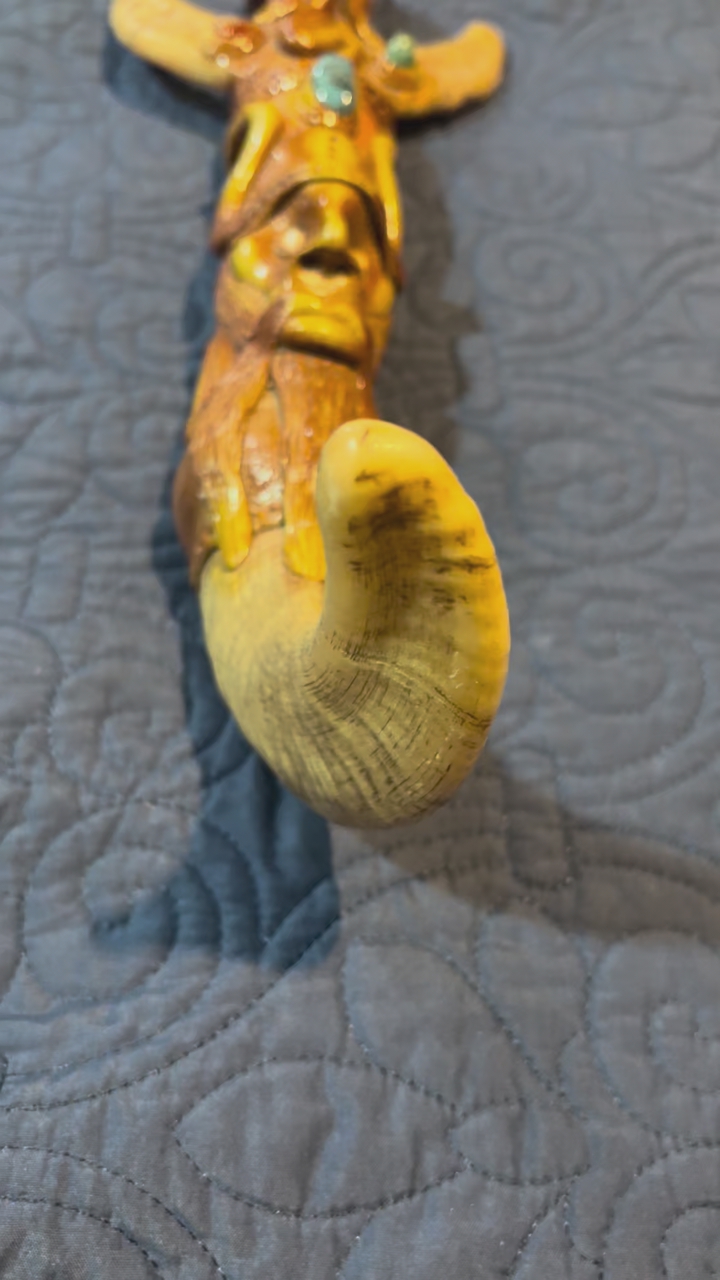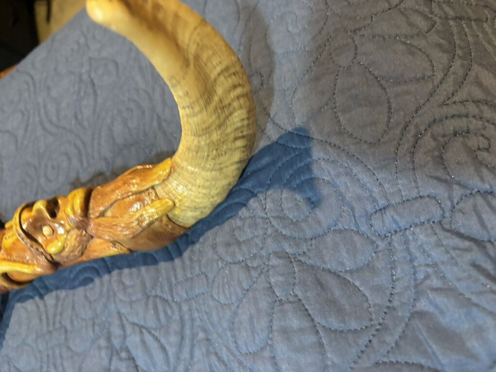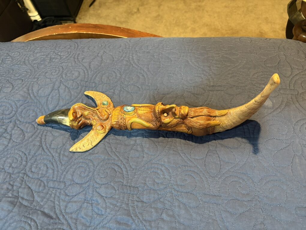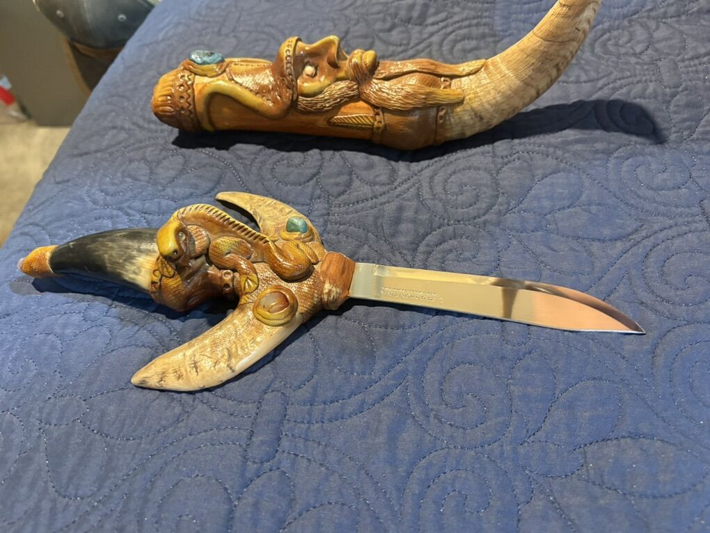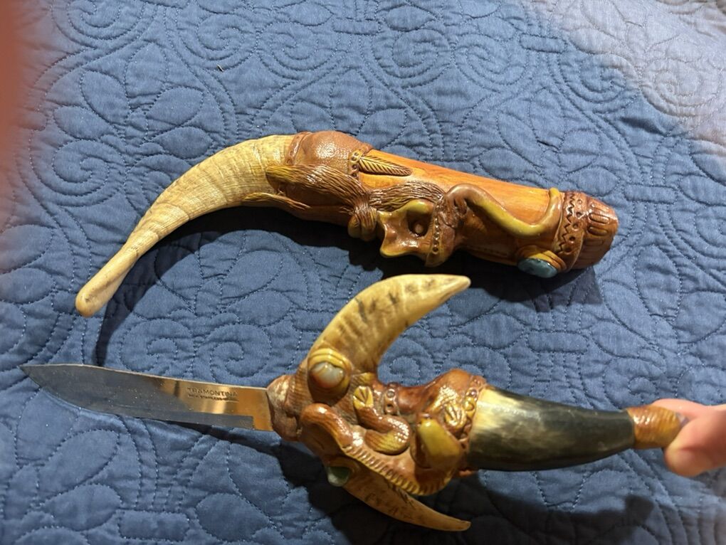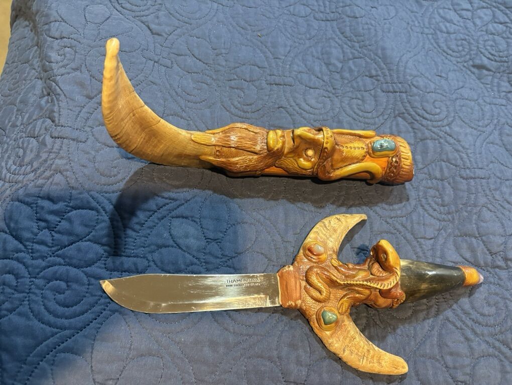 The most telling detail is the stamp on the blade: Tramontina Made in Brazil Stainless. * The Brand: Tramontina is a massive Brazilian manufacturer. They are the Victorinox of South America, known for making reliable, mass-produced kitchen knives and tools. • The Context: In the 2000s (and still today), it was very common for artisans in Ecuador and Peru to purchase high-quality, inexpensive industrial blades from Tramontina and then re-handle them with elaborate, hand-carved designs to sell as high-end souvenirs or decorative art. 2. The Artistry: Handle and Sheath The soul of this piece is entirely Ecuadorian. This style is often found in artisan hubs like Otavalo or Cuenca. • Materials: The dark, polished tip on the handle and the curved end of the sheath appear to be bovine (cow or ox) horn, which is a traditional material for Andean carvers. The rest of the body is likely a mixture of carved wood and perhaps a resin-based composite used to achieve those fine, sculptural details. • The Imagery: The carvings are a mix of Green Man aesthetics and local folklore. You can see a bearded, forest-spirit face on the sheath and what appears to be a serpent or a crouching figure on the hilt. The inlaid gems are likely glass or polished local stones like sodalite or jasper. • The Style: This is often referred to as fantasy folk art. It isn't a traditional weapon used for a specific task; rather, it's a showpiece designed to showcase the carver's imagination and technical skill with organic materials. 3. Historical Context Buying this in the 2000s fits perfectly with the boom in Ecuadorian artisan markets catering to international travelers looking for unique, mystical hand-crafted items. While the blade itself is a utility tool, the handle and sheath turn it into a unique piece of sculpture.