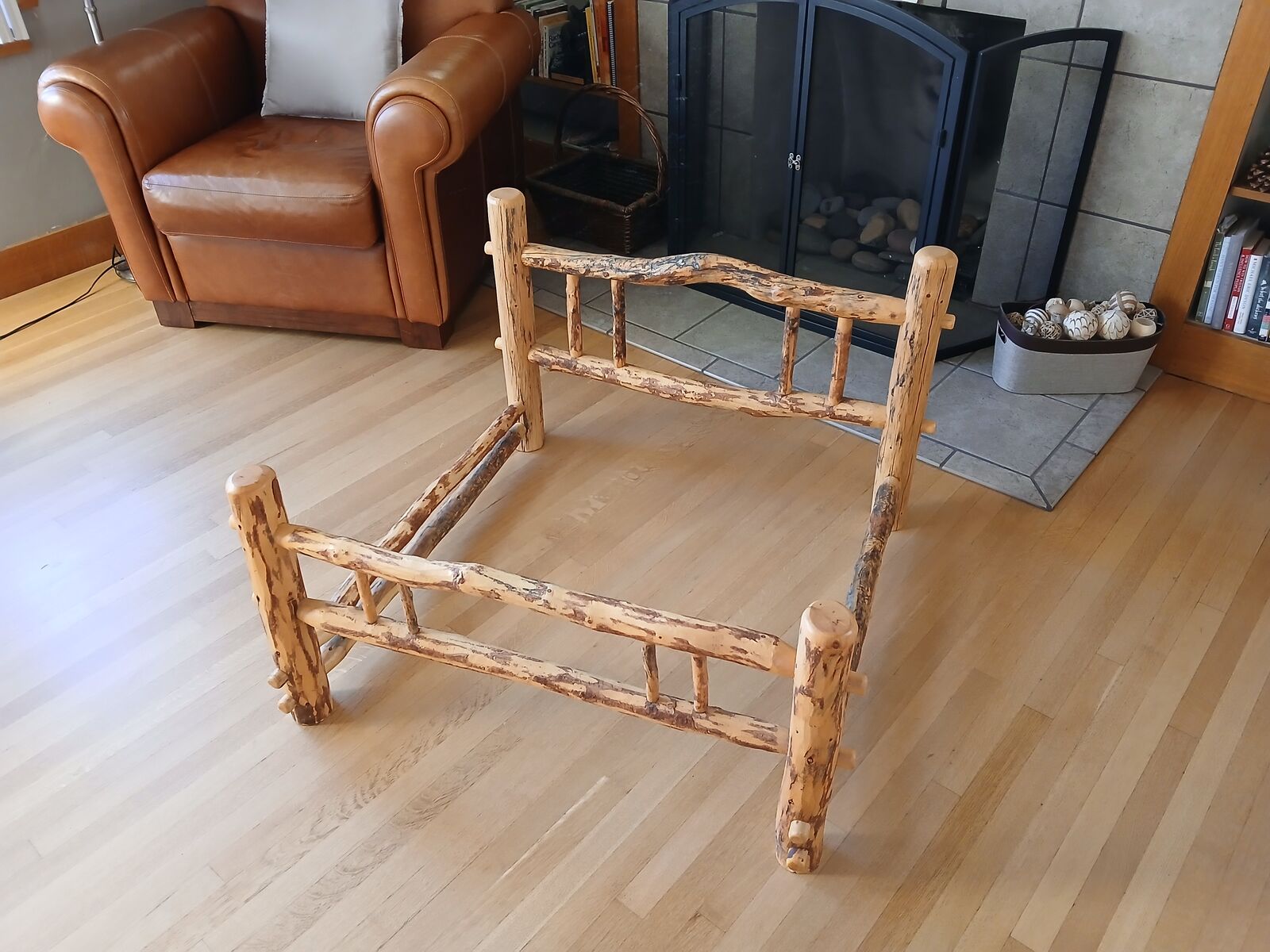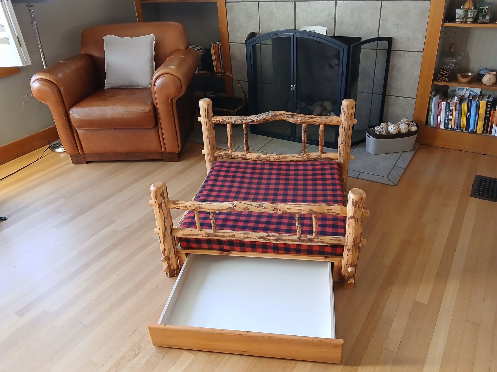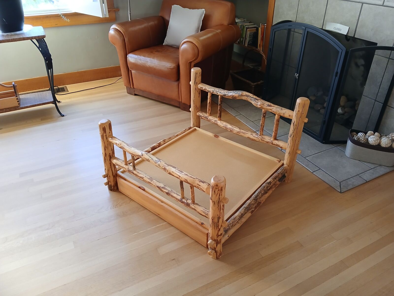 This charming bed measures: Length 36" X Width 36" Height ( headboard 24", footboard 20"). The mattress measures 31" x 31" and has an easy-to-remove, machine-washable cover. New covers can be made inexpensively to match your decor. A 26" X 23" X 2.5" drawer helps keep brushes, leashes, and other dog items well organized. This bed was designed for a medium to large breed size dog.