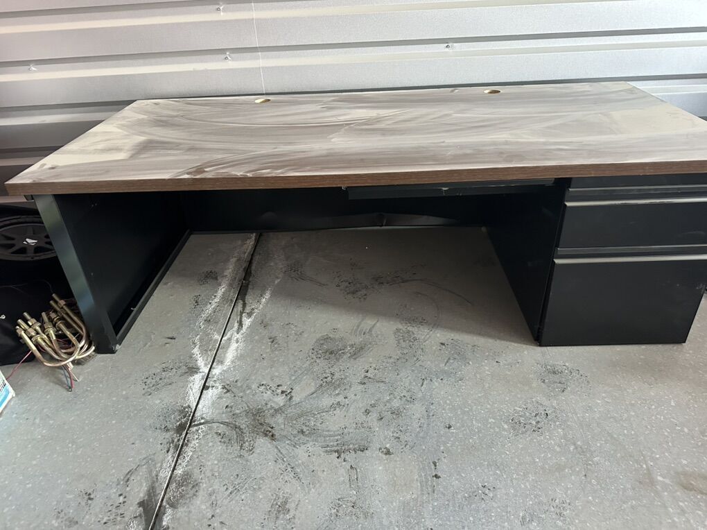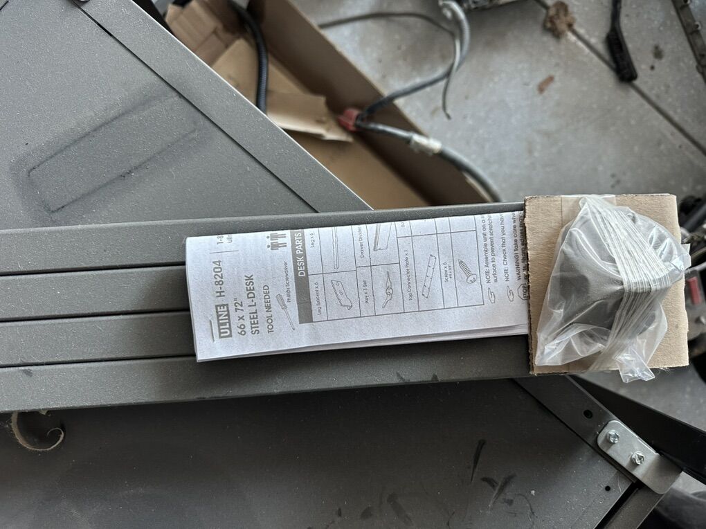Venmounused uline steel desk on h-8204 66”x72” dent on back shown in third photo of main it’s dusty from sitting in storage but otherwise is in good shape. Message with questions