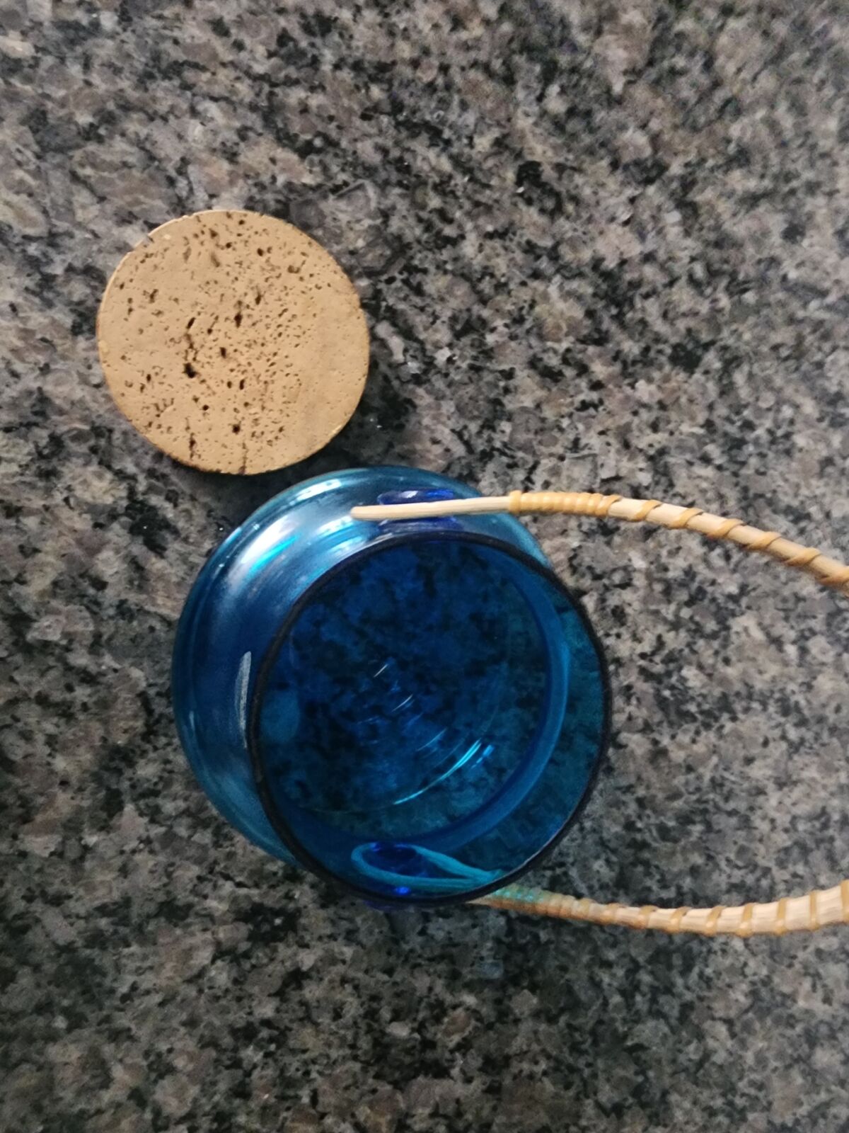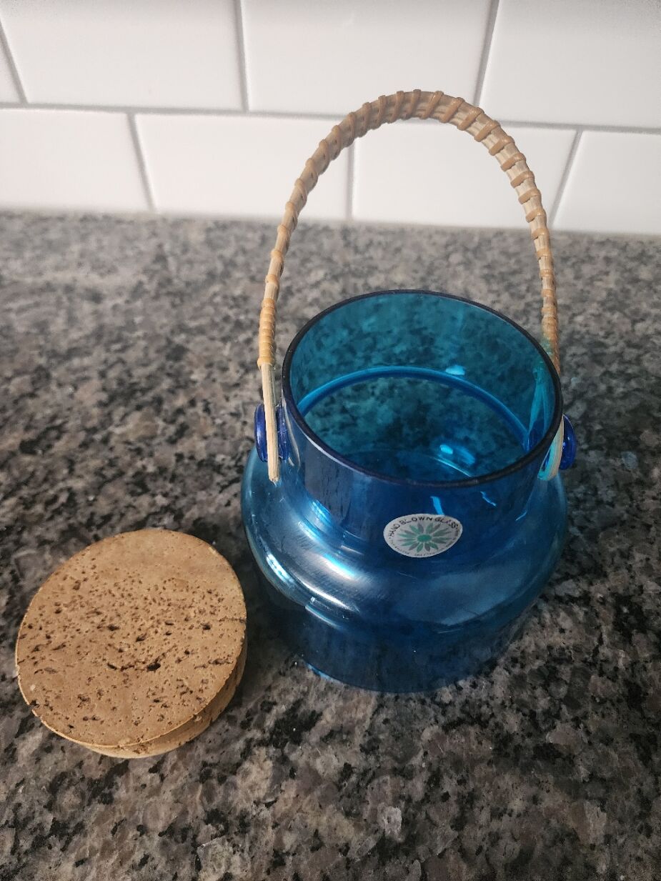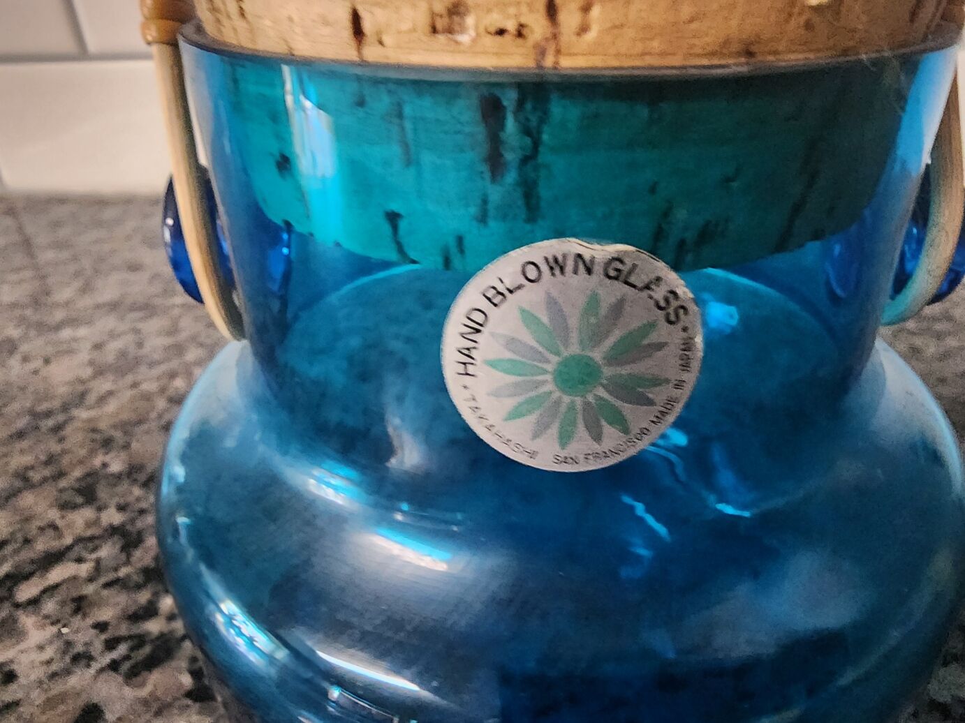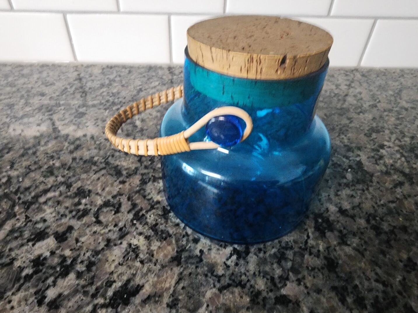 Gorgeous Deep Aqua Blue Vintage Glass Vase Container with a Mid Century Modern Raffia Handle, large cork. Made in Japan. This hand blown glass container was made in Takahashi, Japan (still has original sticker) for a San Francisco Company in the 1960’s. Excellent vintage condition, no cracks or chips. The Raffia handle is in excellent condition, and the cork is in excellent condition. 5.75” tall with cork inserted 5.25” across bottom 4” diameter (mouth of container) 10” with the handle standing straight up.