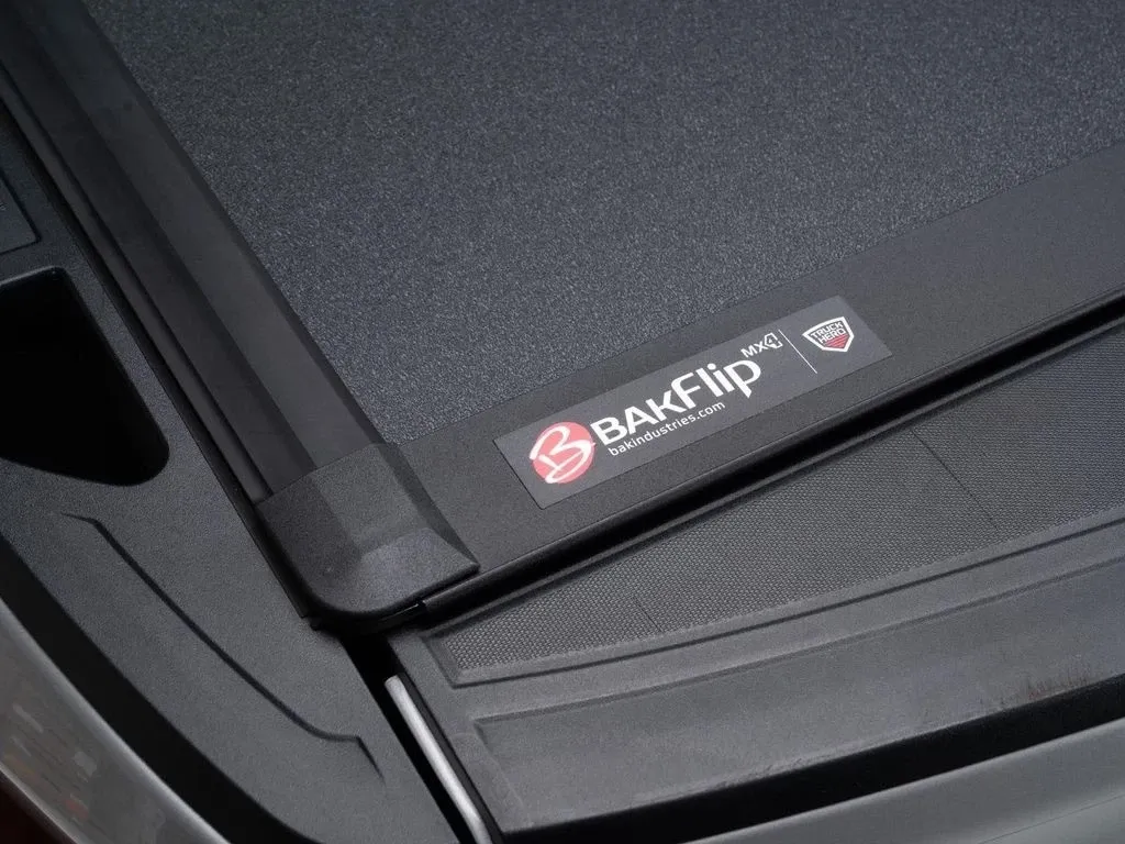 BakFlip MX4 Premium Hard Folding Tonneau Cover (448332) by BAK®. Add a little extra style to your truck's decor and safeguard your truck bed against dirt, grime, rain and snow with this premium grade aluminum hard folding cover. The BakFlip with a sleek no-profile flush mount design features a superior flat matte black texture with the highest possible UV and scratch protection and an enhanced tailgate seal which allows the truck lid to be closed whether the tailgate is in the closed or open position. MX4 features include an enhanced functionality with pre-molded, die-cut, shock-absorbent bumpers and secure prop rod clips.