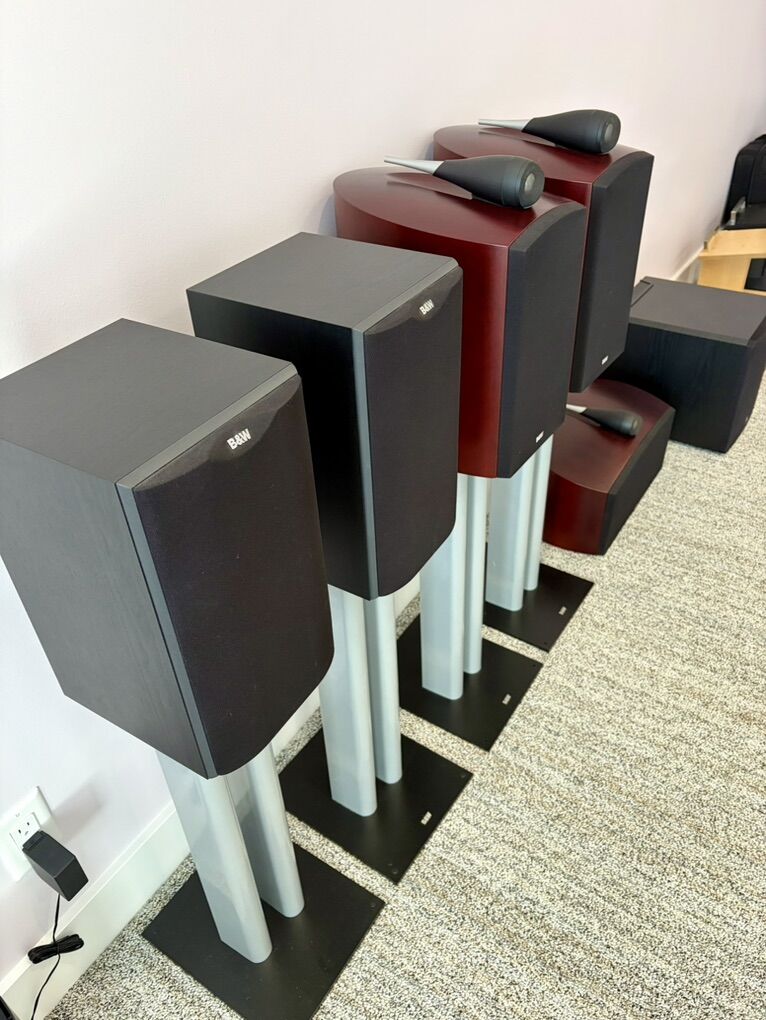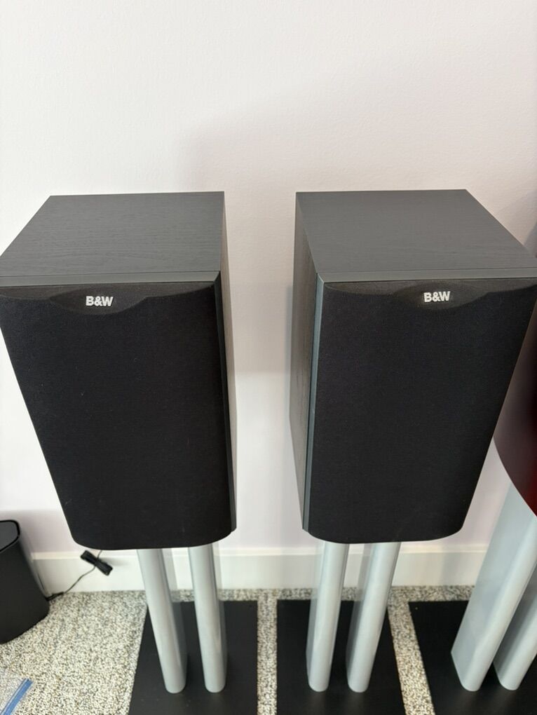 ZelleI have for sale 6 awesome speakers with stands to build your 5.1 surround system. The mains and center are from B&W’s top tier speaker line at the time, the 800 series, while the surrounds are from the entry level 600 series. The subwoofer is a very musical 10” sub that excels in both Low Frequency Effects (LFE) in surround sound, as well as augmenting the low bass frequencies when listening to music in 2-channel stereo. Everything is in mint condition, with the exception of one of the small B&W logos on one of the speaker stands is missing.