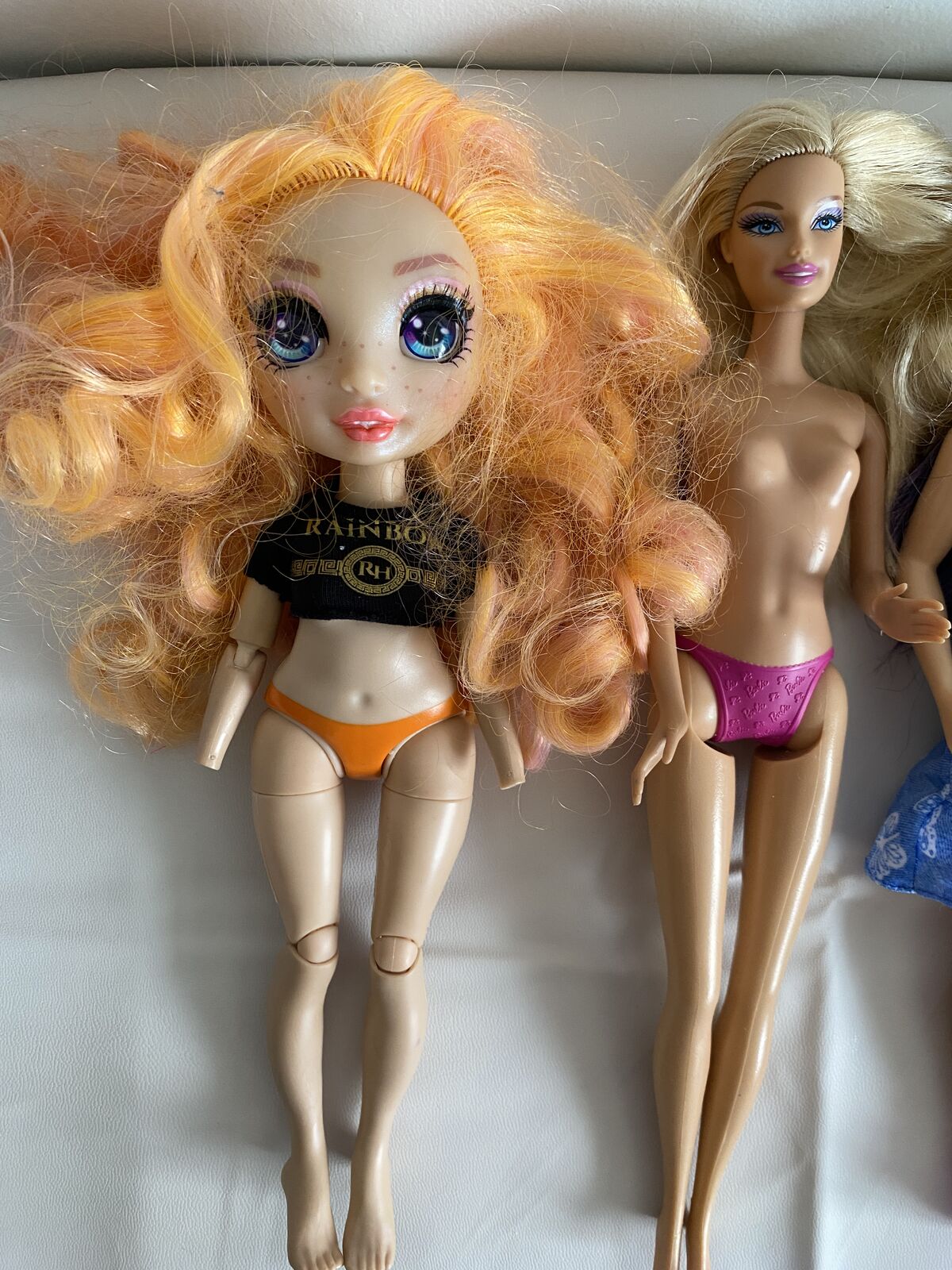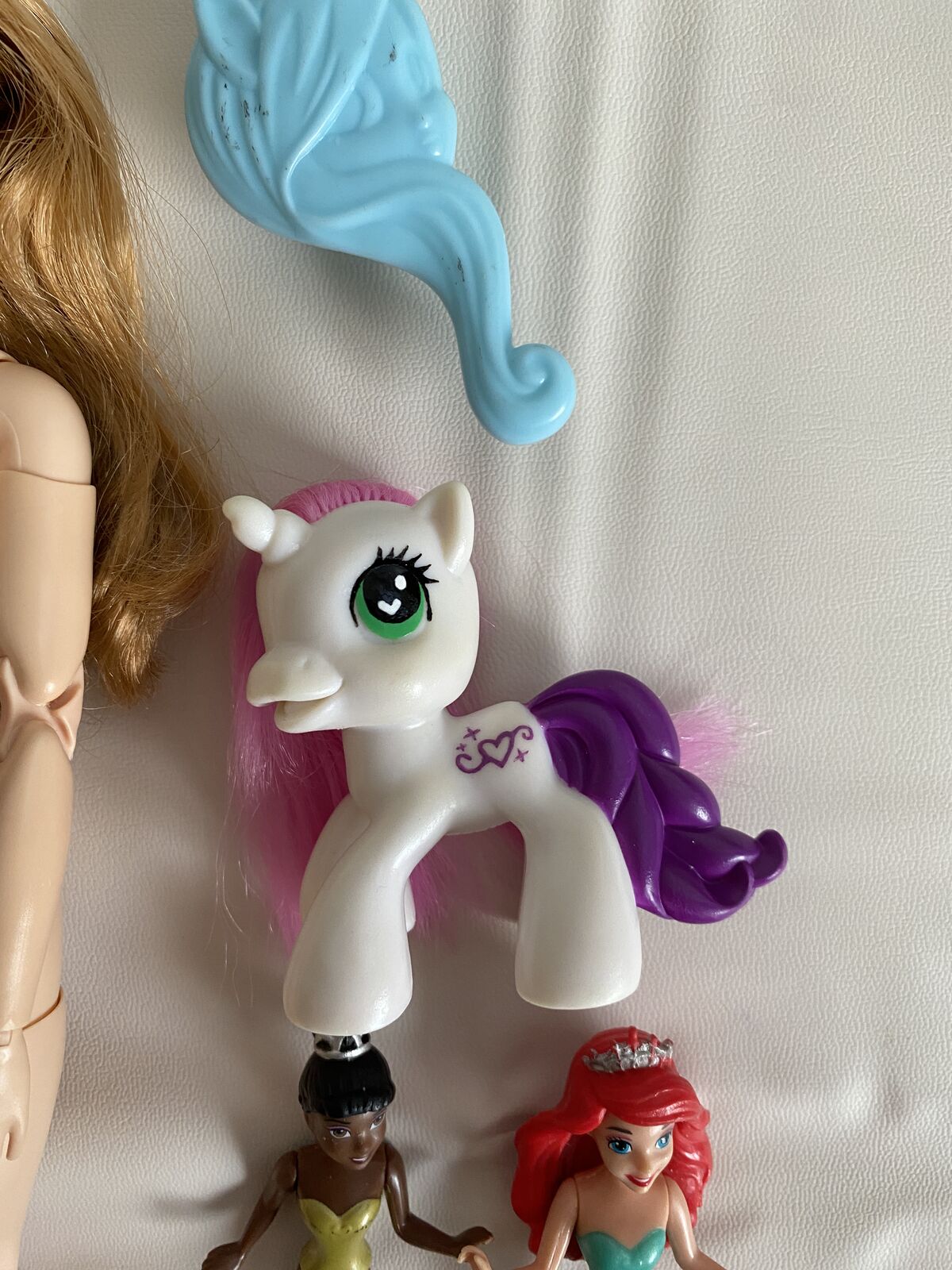 One Rainbow High Poppy Rowan doll with no hands, four Barbies, one G3.5 My Little Pony, a hairbrush, and four little Disney Princess figures. In good condition