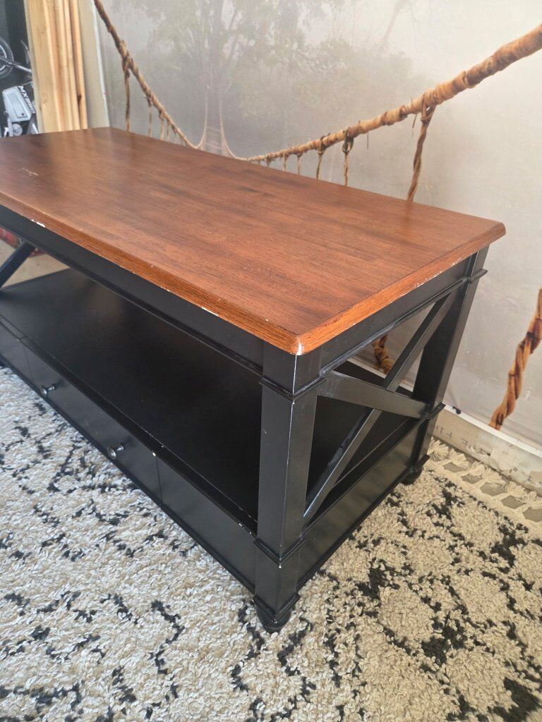 Venmo47.5W X 22D X 25H. Tv stand in good condition. Black and brown. Fcfs. Cash or Venmo only.