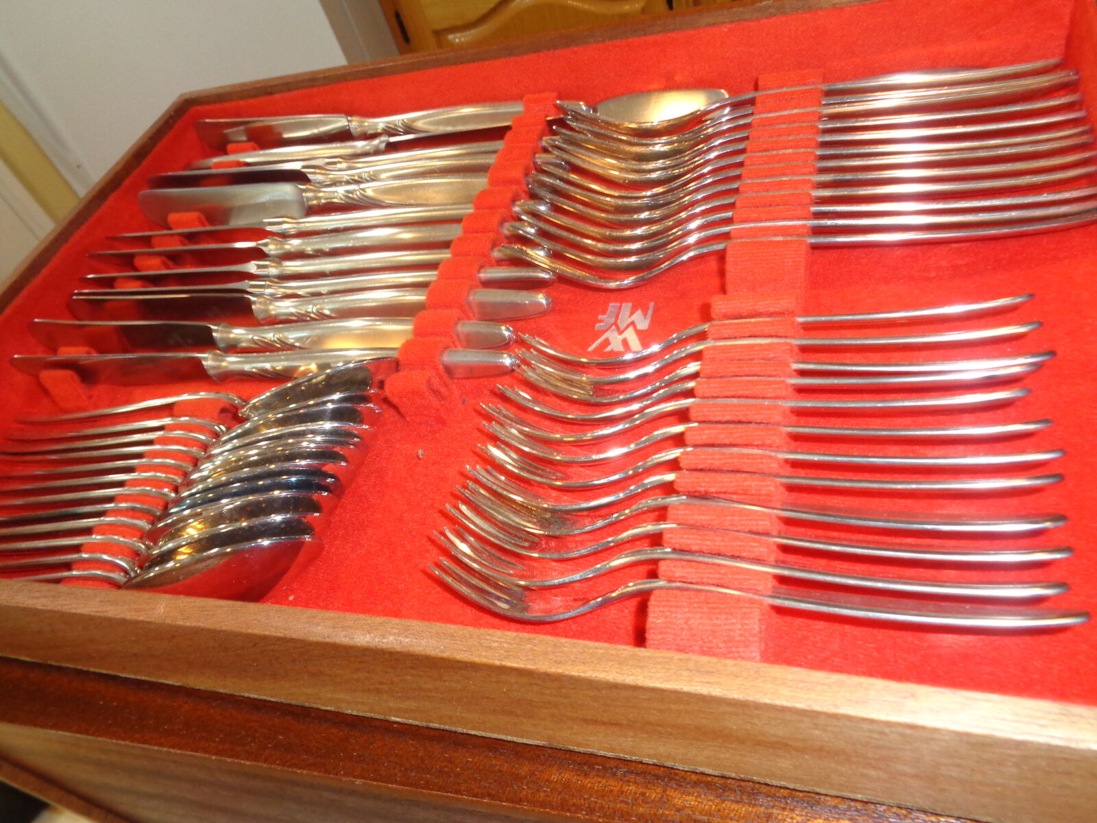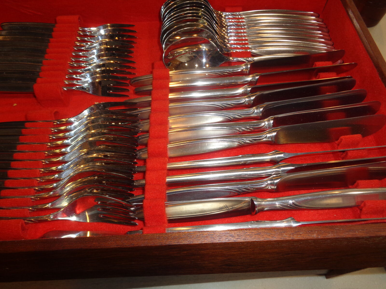 Silver plated dining set - 80 pieces - in wooden display unit. Has been appraised by silver dealer as silver plated. Includes place settings for 8 plus serving utinsels. can be available for inspection. Will consider offers after inpection.