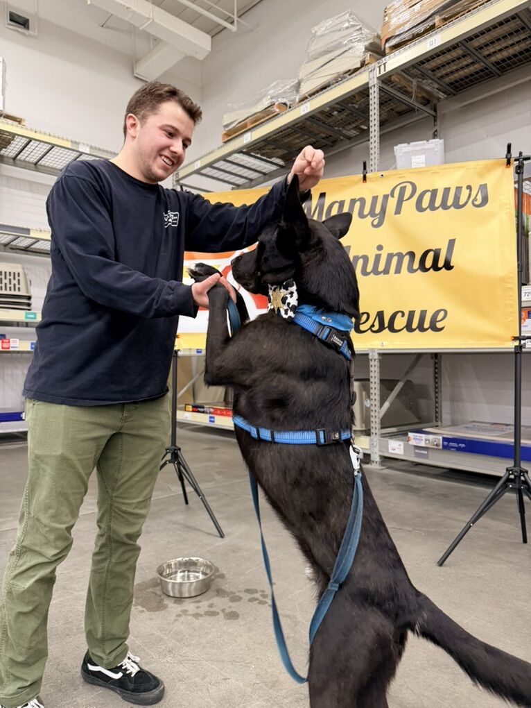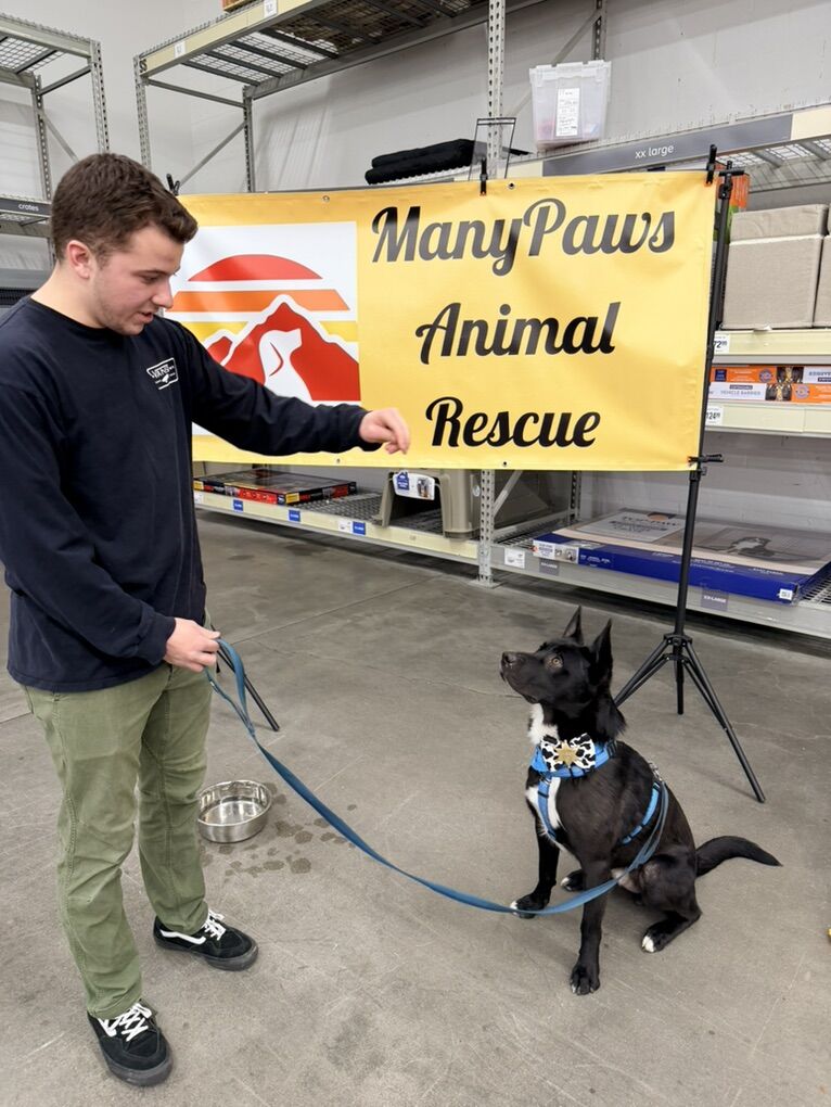 GooglePayMeet Sheriff! This approximately 3 year old medium–large mixed breed has the softest black fur and the most adorable floppy ears you’ll ever see. Sheriff is a fun-loving, goofy boy who’s equal parts cuddly and playful. Sheriff is incredibly smart, food motivated, and full of energy. He has lightning-fast zoomies and absolutely lives for chew toys. Because of his active brain and body, he’ll thrive in a home that can provide plenty of mental stimulation and physical exercise. The good news? Sheriff already has a great foundation! He knows how to sit and shake, is both crate trained and house trained, and walks like a true gentleman on a leash. He’s kid-friendly, though he’d do best with children who can handle some enthusiastic jumping and rough-and-tumble play while he continues learning his manners. Sheriff is also dog-friendly and would be delighted to have a canine sibling in his forever home. He’ll need a tolerant, energetic dog friend who can keep up with (and forgive) his playful shenanigans. Right now, Sheriff is working hard on his house manners and his “place” command, which is helping him stay off the counters and learn how to settle and take breaks.