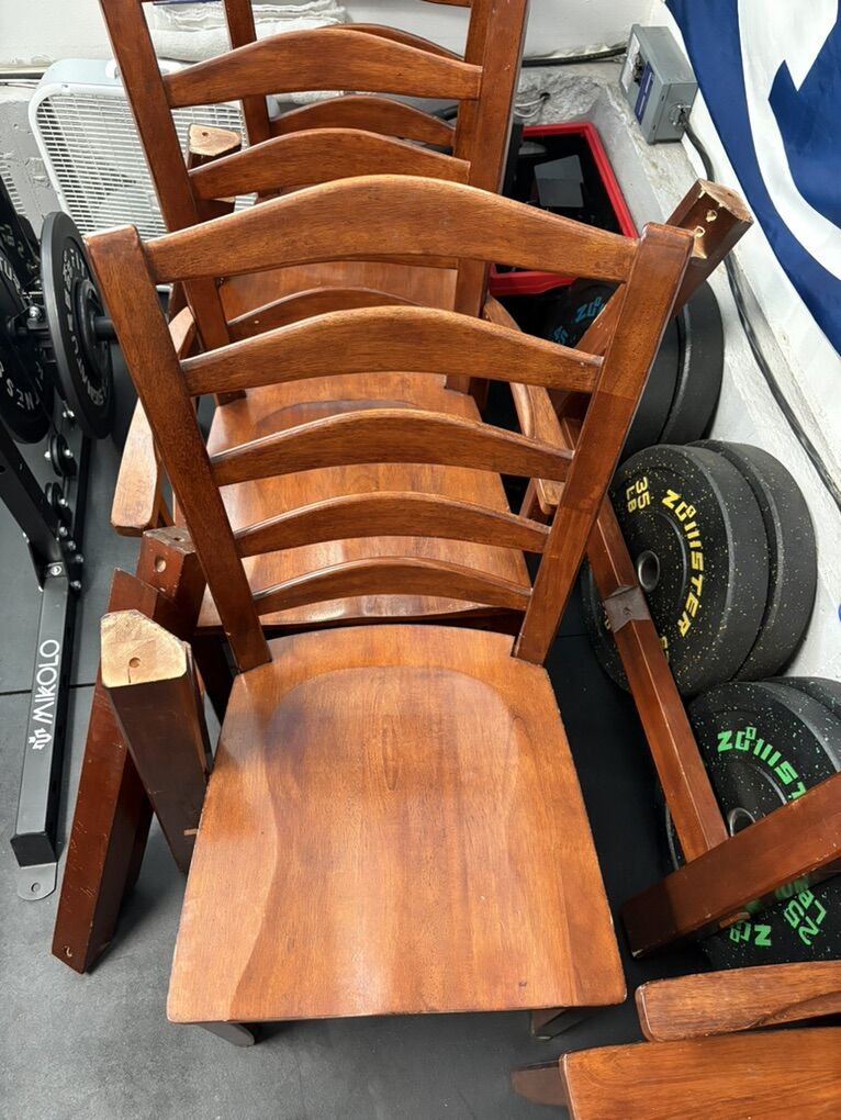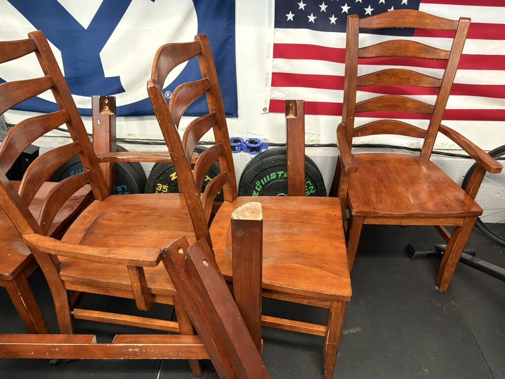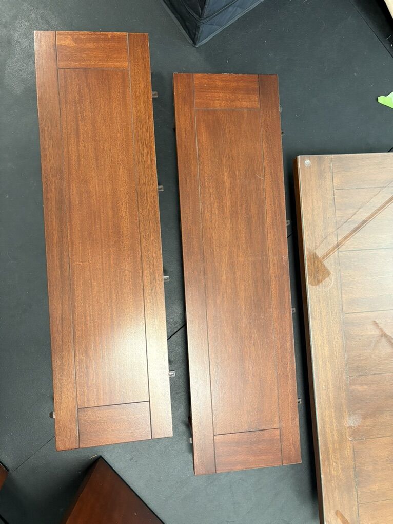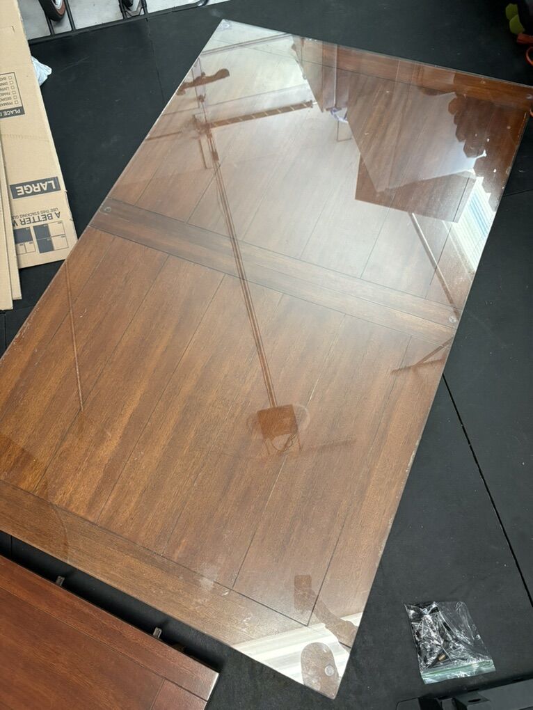 ZelleSturdy wood table with glass top, 4 chairs and 1 bench. This table is 72” x 44” and comes with 2 leaves, 12” each. The full length of the table with both leaves is 96”. The legs are solid and very sturdy with supports extending to the middle of the table. The chairs are also very solid. 2 chairs have arm rests and 2 do not. The bench is 72” long and also has a removable leaf. The leaf is 24” long, so the full length of the bench is 96”. I purchased this table in a set with some other furniture and had to disassemble it to get it home. That is why it is disassembled in the picture, but I have all the hardware to get it back together.