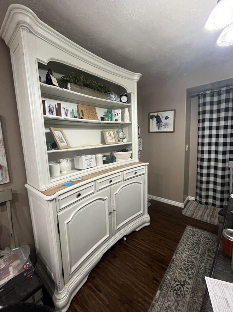 ZelleI paid $500 for this beautiful hutch but we need the space. I bought it redone, it is distressed, very heavy, well built, two piece hutch. Drawers slide easily, no issues with hinges on doors. (See any thing you like on the shelves? Shoot me an offer) Need gone ASAP