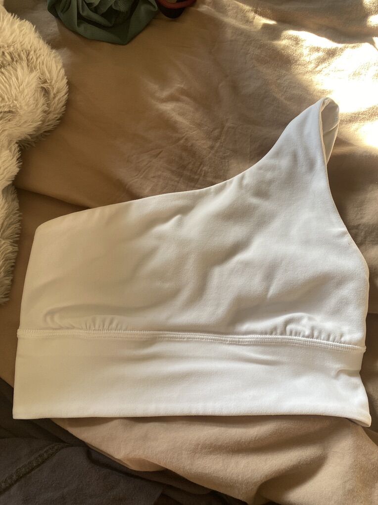 ZelleLulu Lemon One Shoulder White Sports Bra, size 4. Lightly worn. Originally paid $60, asking for $25.