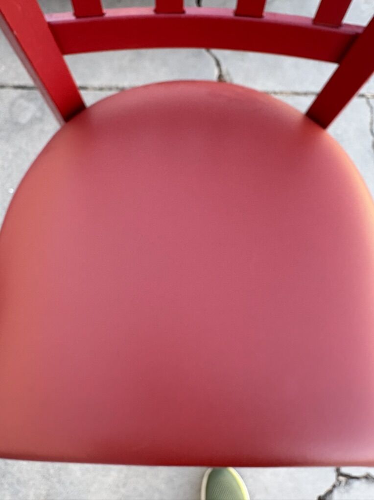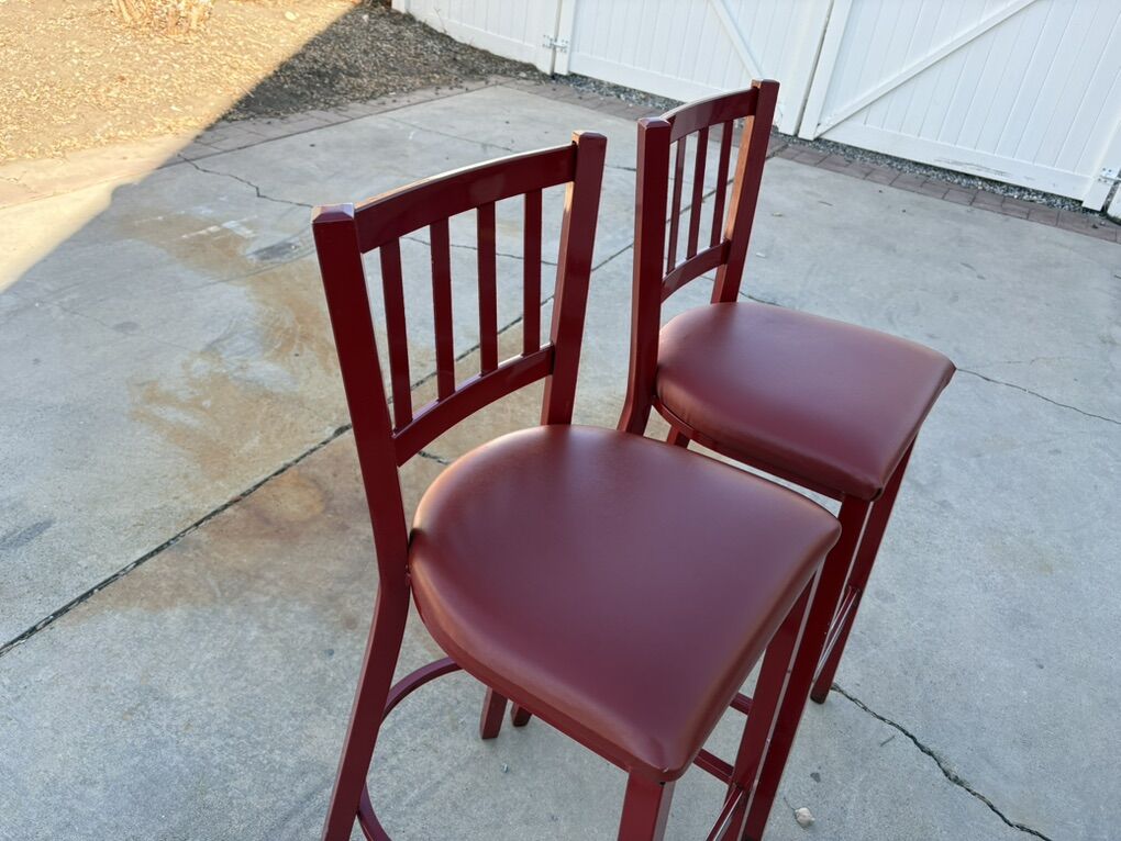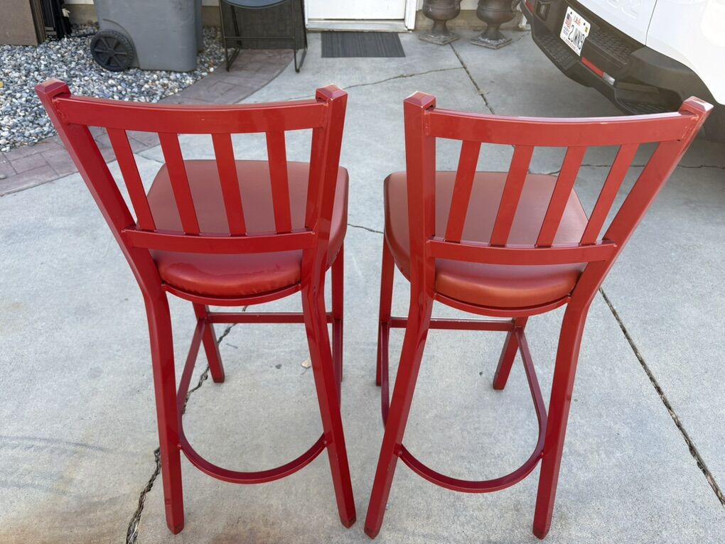 Two red bar stools Excellent condition 16 x 16 with the seat 32 inches high Backs Backs are 44 inches tall