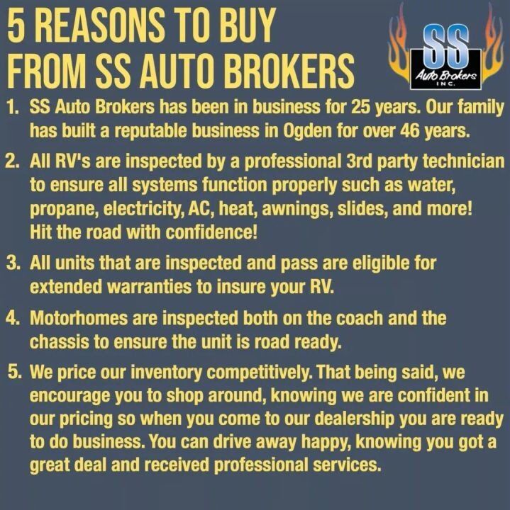 Temperatures are up and it’s time to get out and adventure! Get your family and friends out this summer with style and comfort from your own trailer or motorhome! Prime camping season = prime pricing here at SS Auto Brokers! Be a smart buyer and shop with the little guys to save you time and money! Our prices will NOT be beat!