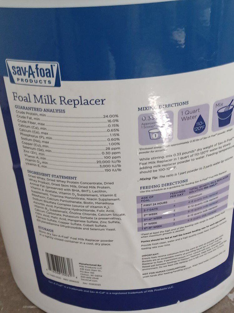 I bought this for an early colt. I used 3 cups total out of the bucket. My colt didn't make it. Good to have on hand for emergencies.