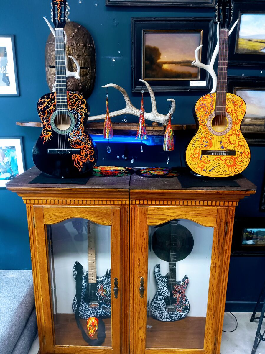 Electric Guitar in a Wood Case and glass door for display. The electric guitar plays great. No name on guitar, hand painted in Black Light Paint and the Guitar glows in Black Light. $150 with case. cash only. Please Text or call for information. Thanks. 402..972....6916....