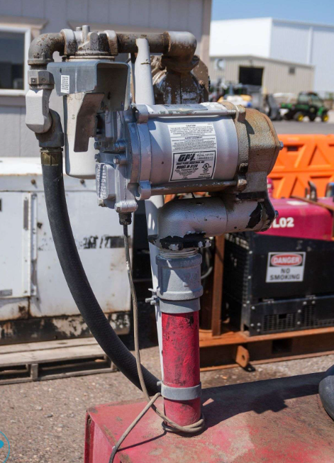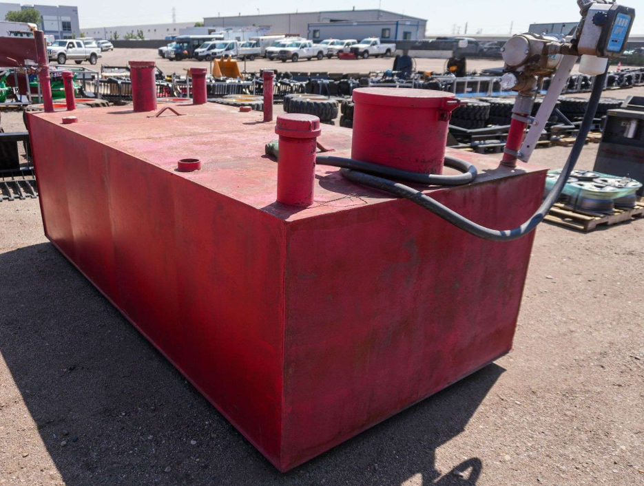 Condition: Tank shows weathered paint and surface wear but is solid and fully equipped. Pump, filter, meter, hose, and nozzle included.