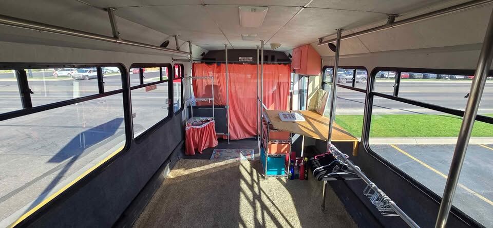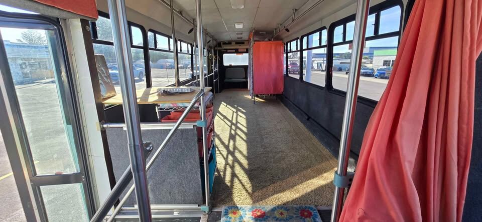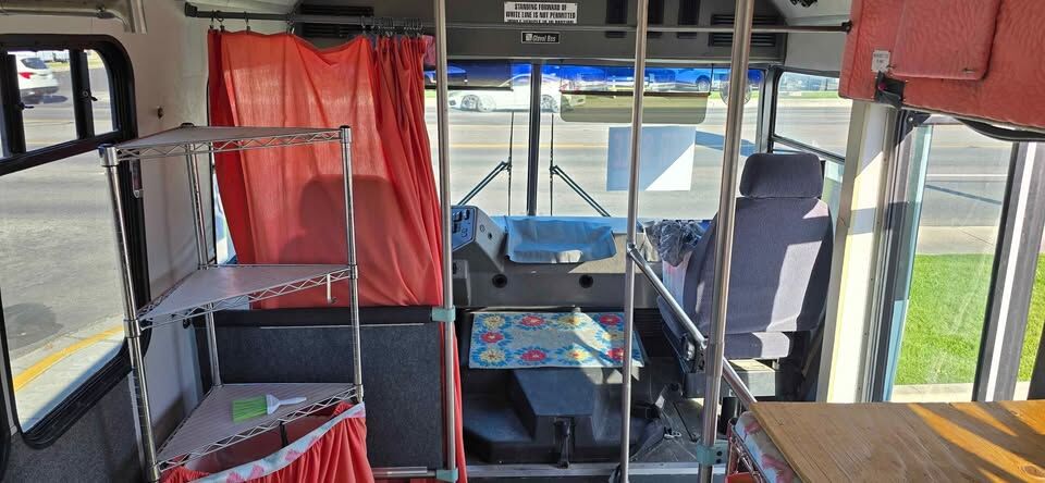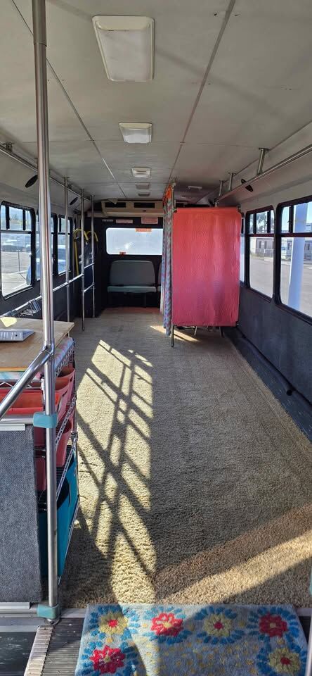 This bus was retrofitted to be a Fashion Bus. It has a carpeted interior, 2 dressing rooms, full back seat w/3 seatbelts, cashiers table and bars on sides from front to back for hanging clothing. It has a 5.9L Cummins Turbo Diesel Engine with an Allison Transmission, the best of both worlds! We no longer have a clothing business, Covid ended that, so looking to give it a new home. EASY to flip this into a full Motorhome for the right person!