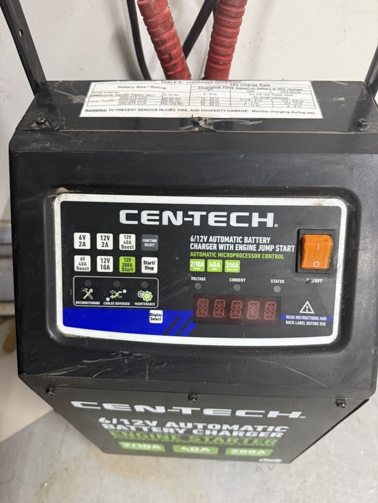 VenmoCharge, maintain, or jump-start 6 and 12V batteries with the CEN-TECH™ 200 Amp, 6/12V Wheeled Automatic Battery Charger with Engine Jump Start. A built-in microprocessor automatically switches the system from charging to maintenance mode to prevent overcharging. This portable battery charger has 2 to 40 amp charging rates plus a 200 amp engine start for emergency starting. Fan cooled for longer service life, this battery charger is ideal for professional mechanics and serious enthusiasts. Microprocessor-controlled automatic battery charger with manual 200 amp starter Easy-to-read LED display Heavy duty copper-coated clamps with 6 ft. 4 AWG cables