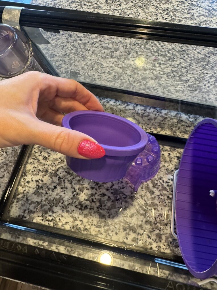 5 gallon glass tank Locking screen lid Water bottle + holder Food dish Igloo house Wheel