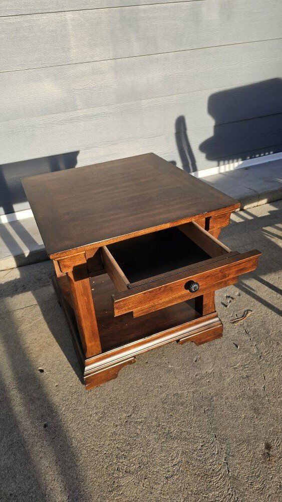 Good condition. Quality furniture. Drawer slides nicely. I have a coffee table that matches. Not brand new but great for someone looking for a good deal on decent stuff. H 25" x W 26" x D 28"