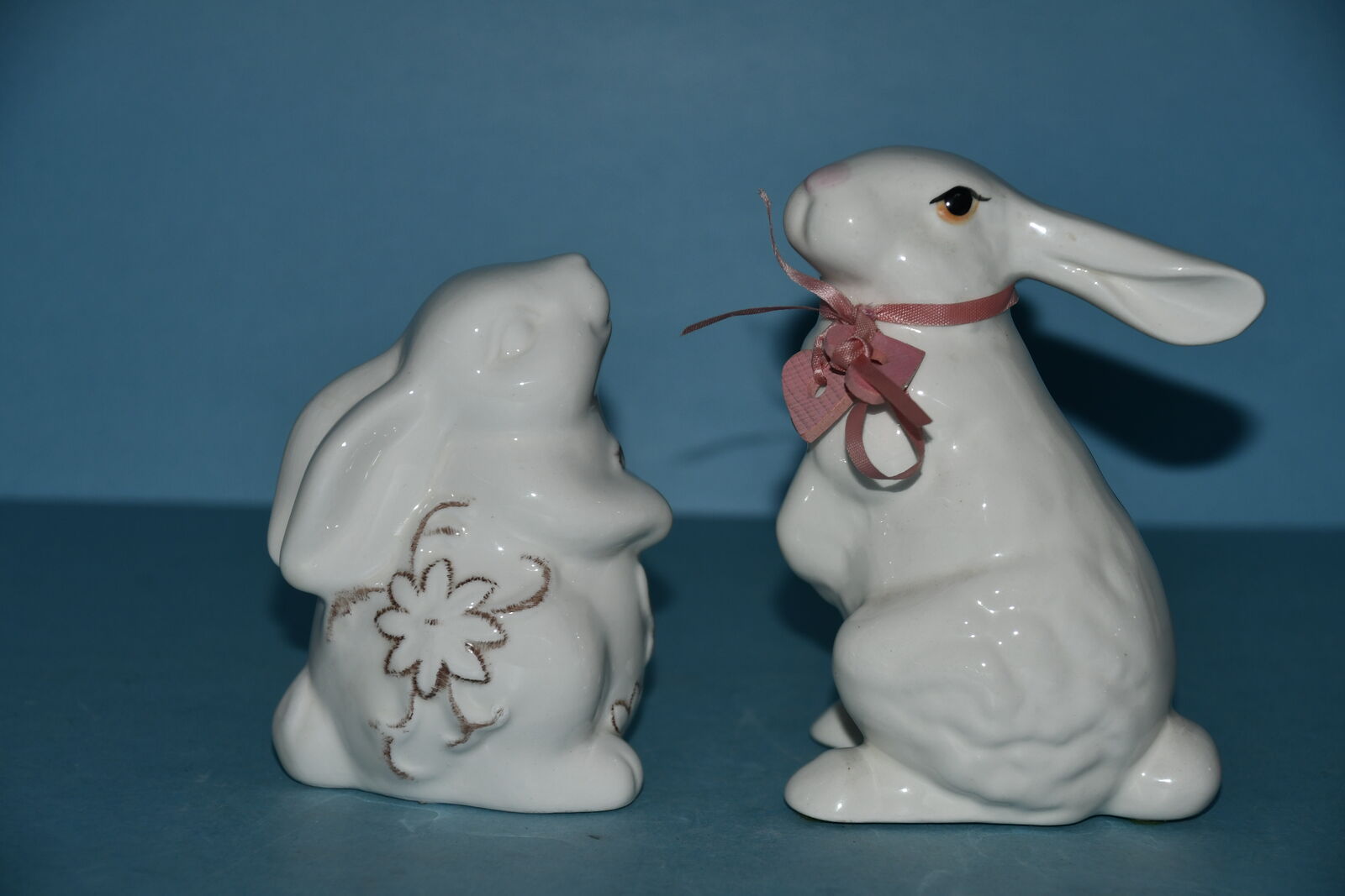 This Set of 3 CERAMIC BUNNY RABBIT FIGURINES are from a smoke free home. They are about 4.5" to 6" in height. There are NO CHIPS. They are CLEAN. Questions??? Please ask. We are located in Plain City. Cash only please.