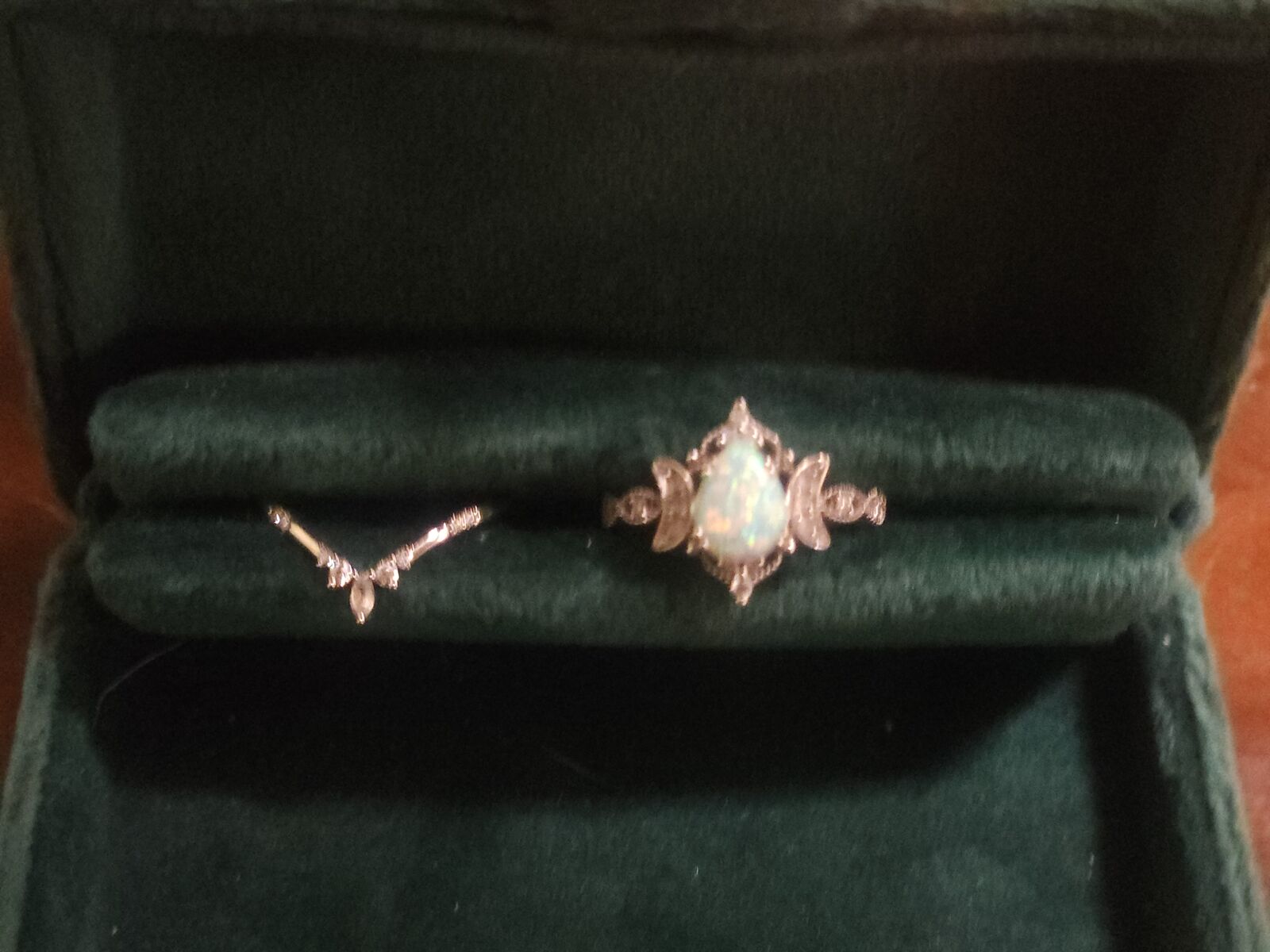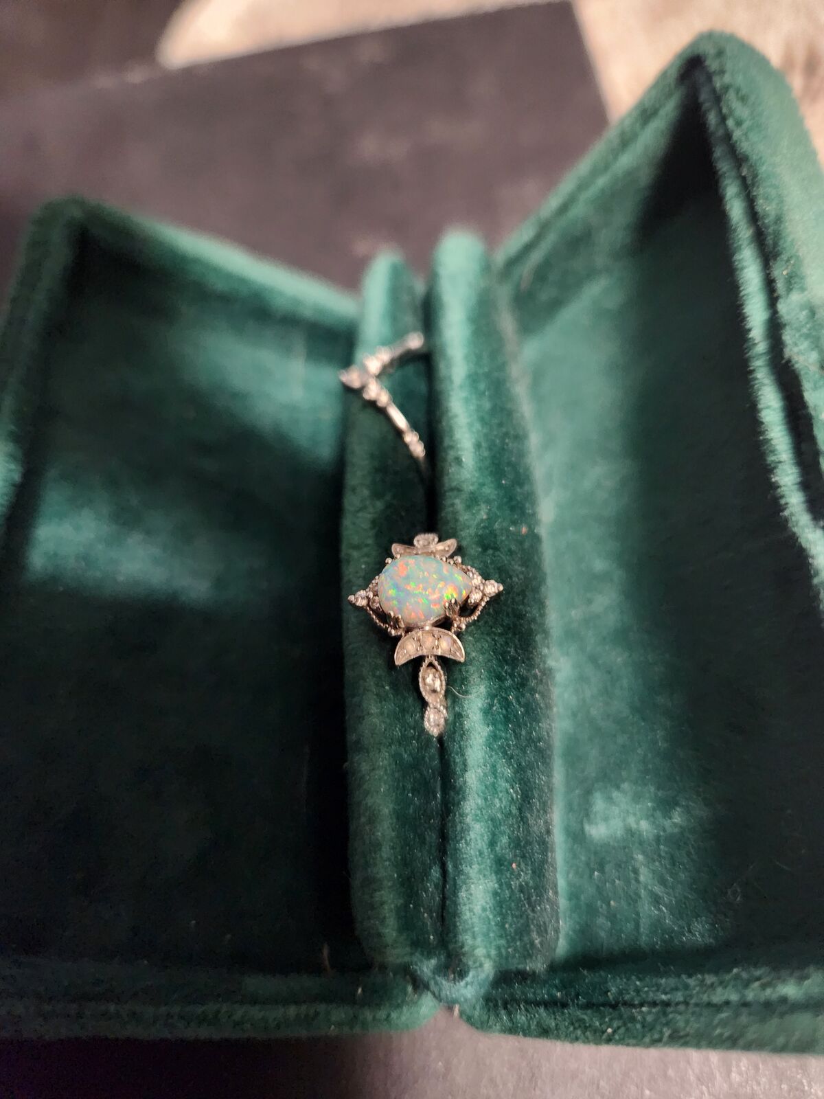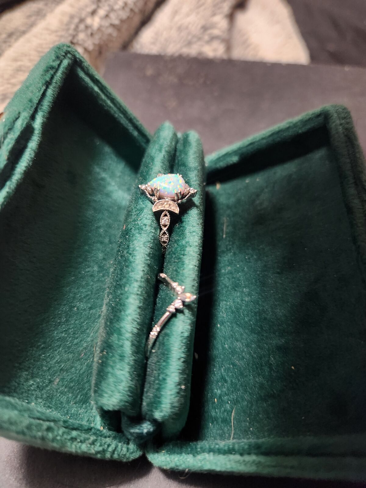 Like new, bought on Etsy for 700. White gold, opal, diamonds. Ring size: 5 and 1/2