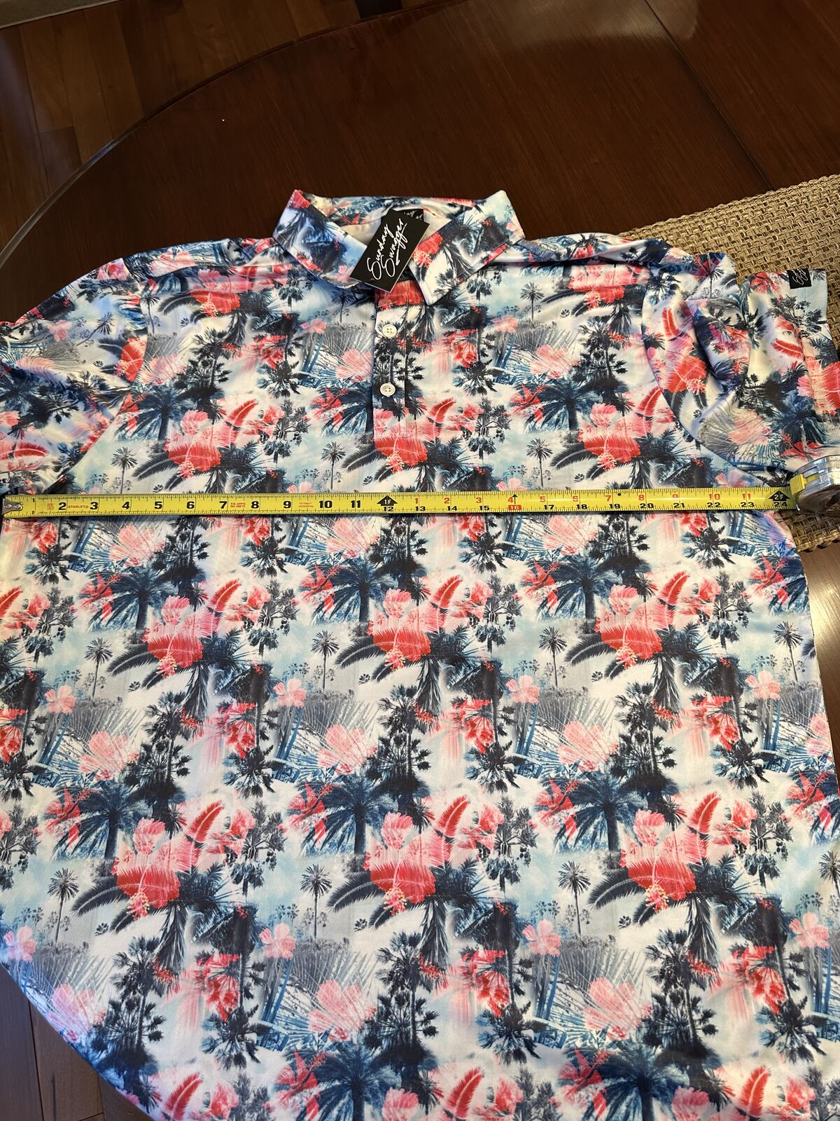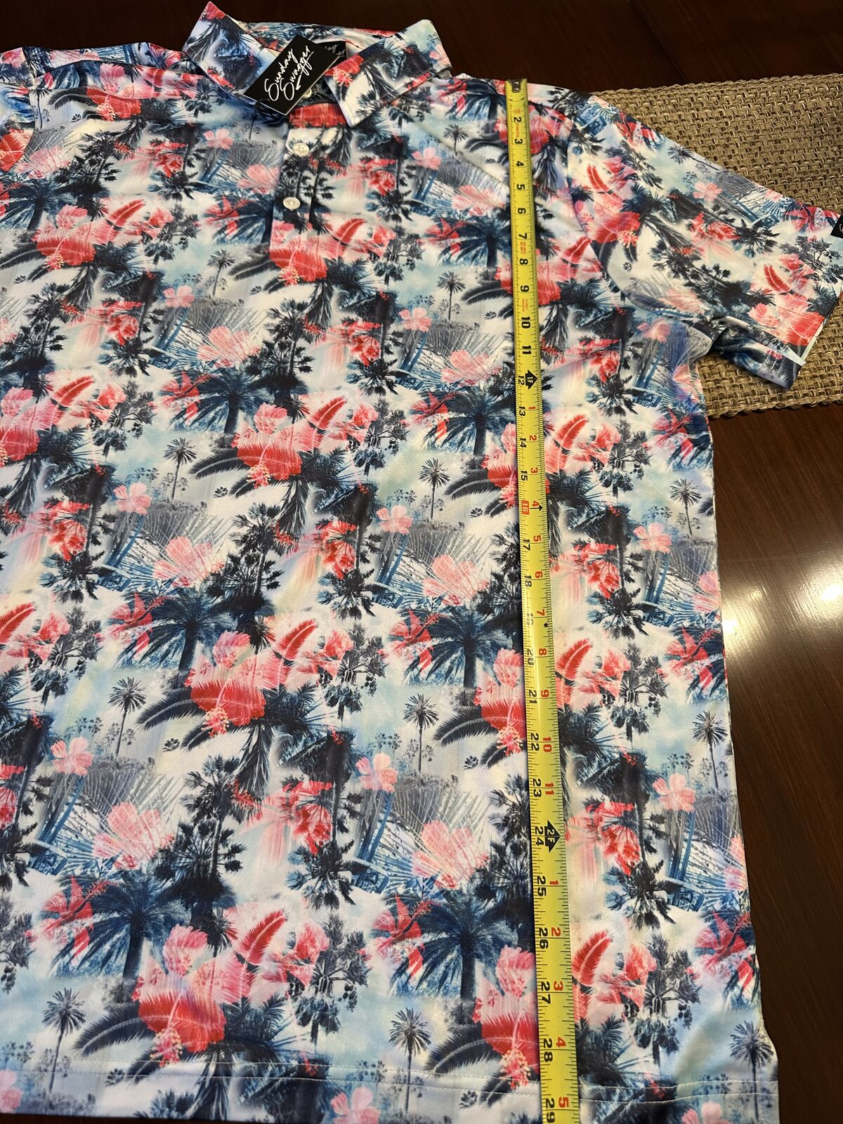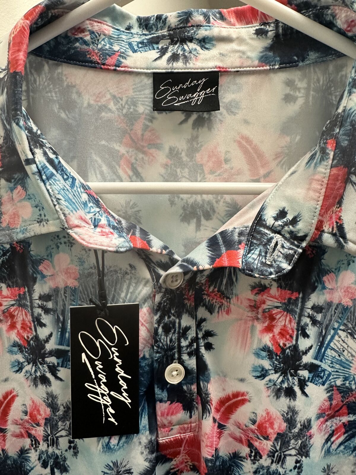 New with tag Sunday Swagger Men's Golf Polo Shirt Size XL. Aloha Print Red White Blue pattern. This shirt doesn't have a size tag shown (not sure why), but I have measured it, and it matches up with an extra large. Logo on the sleeve.