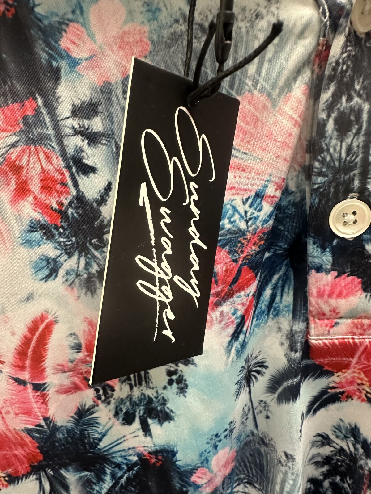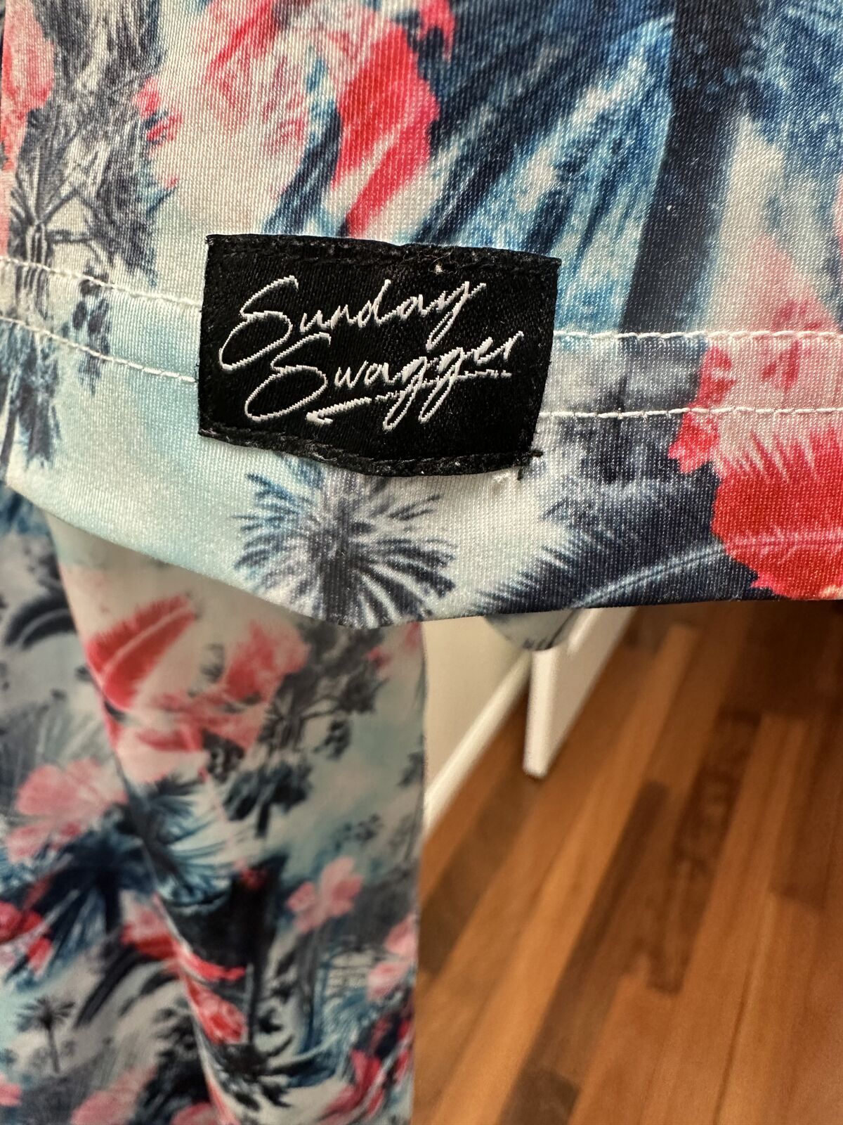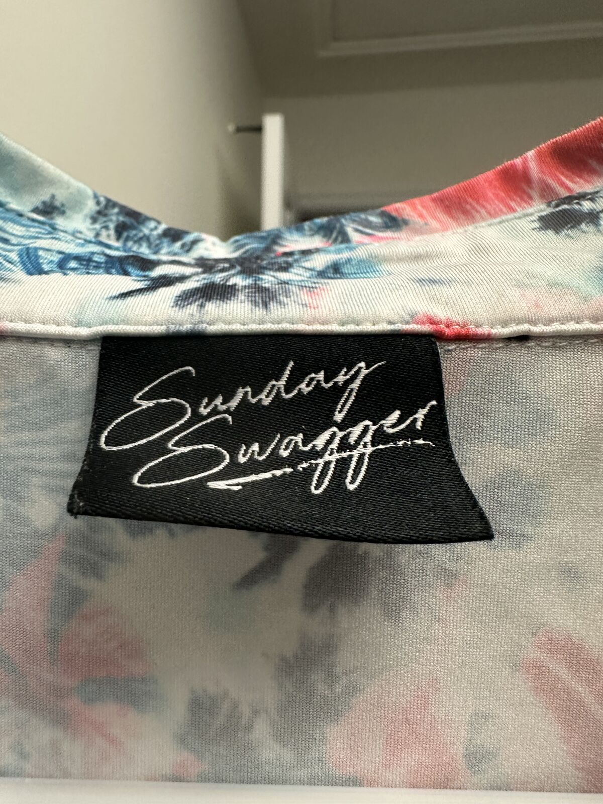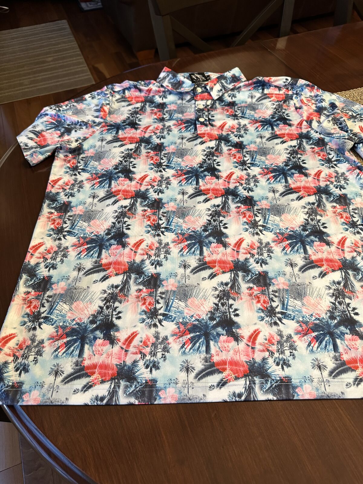 New with tag Sunday Swagger Men's Golf Polo Shirt Size XL. Aloha Print Red White Blue pattern. This shirt doesn't have a size tag shown (not sure why), but I have measured it, and it matches up with an extra large. Logo on the sleeve.