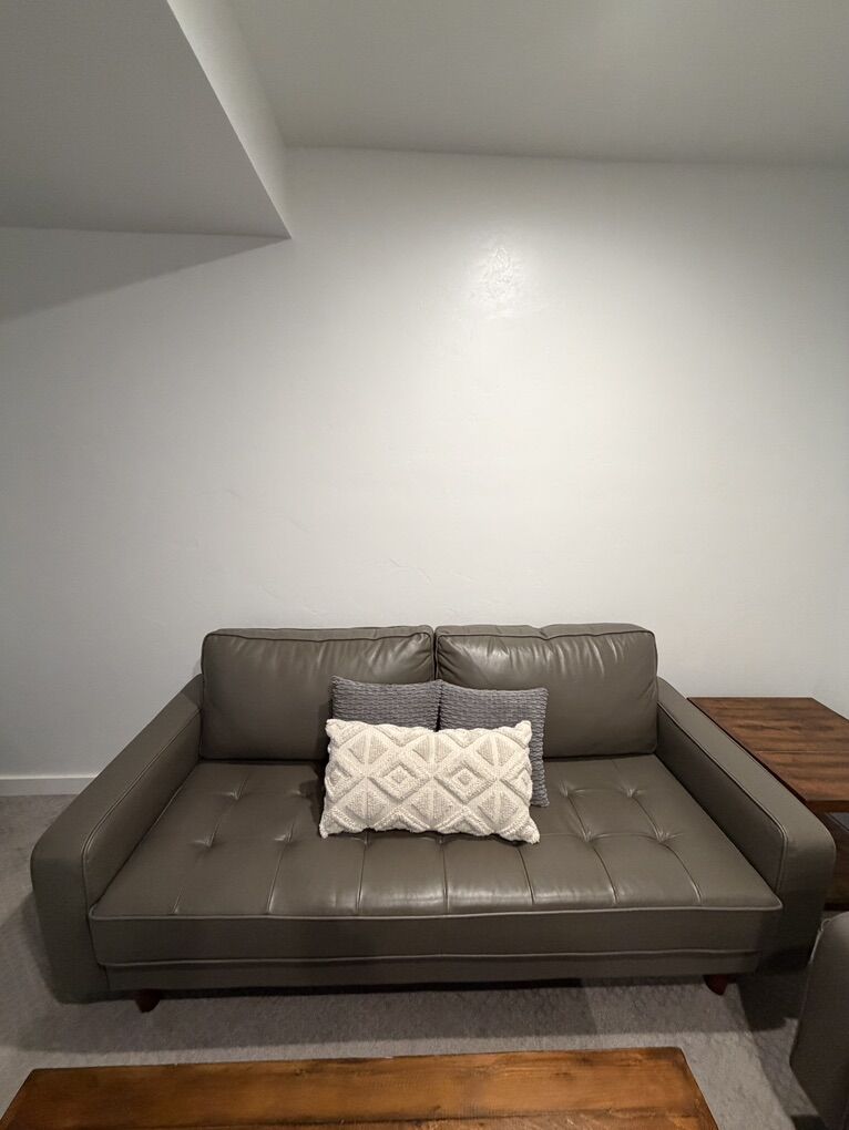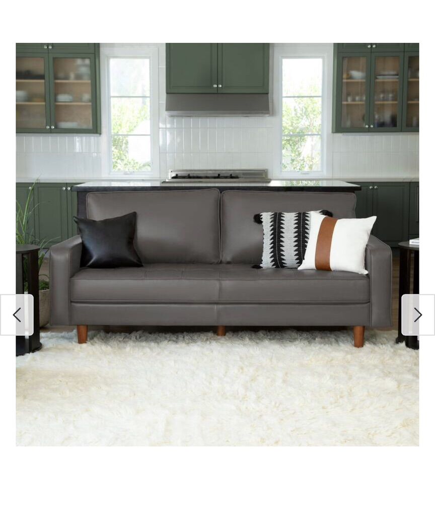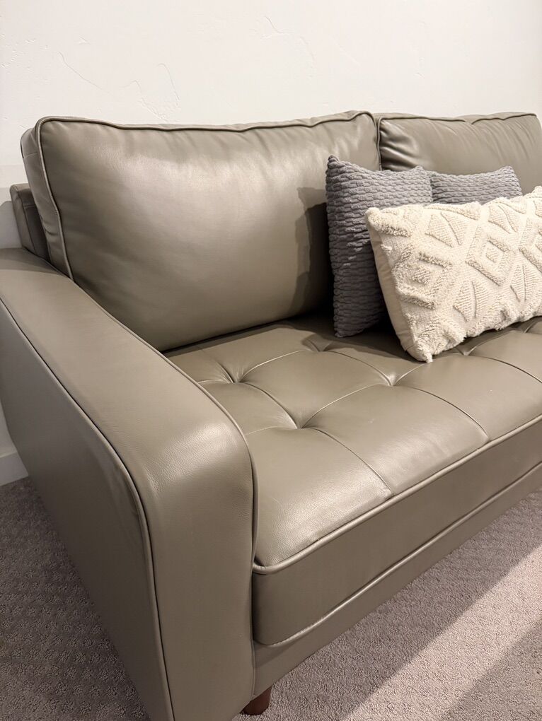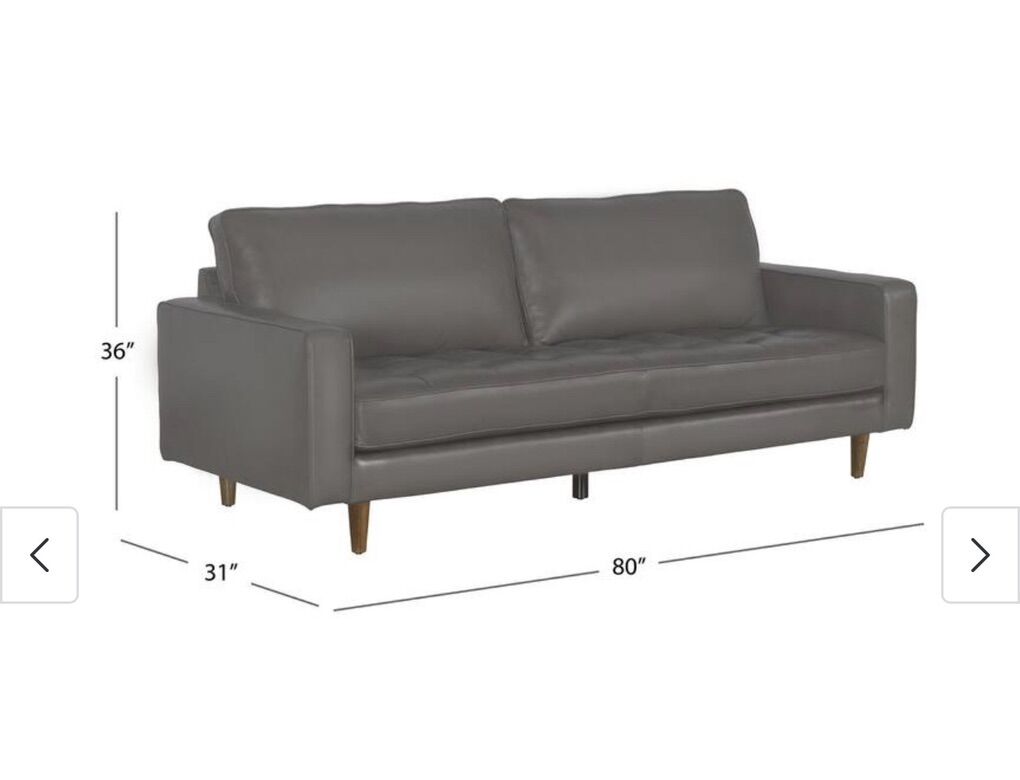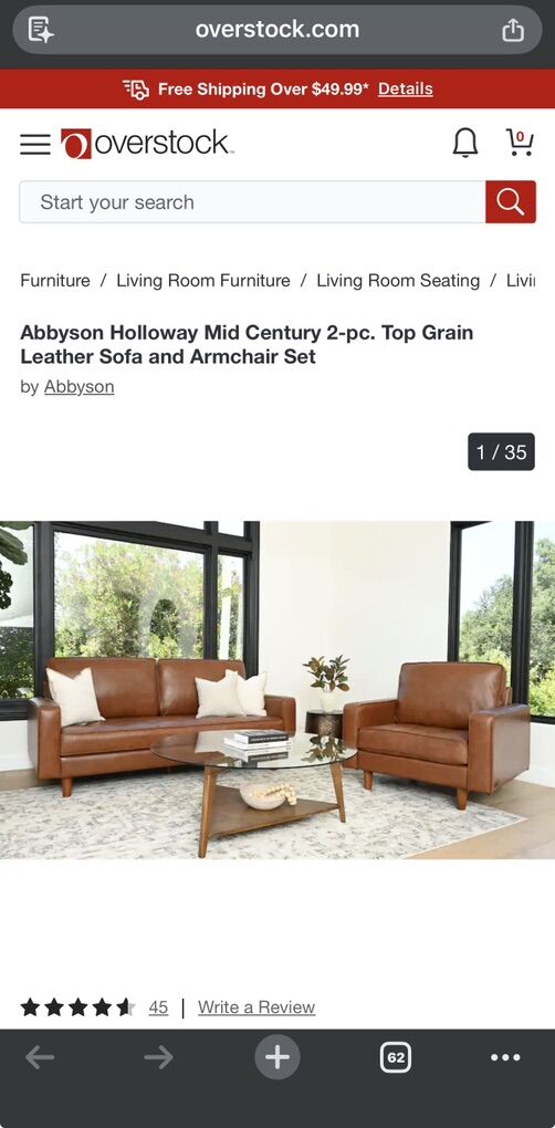 ApplePayAbbyson Holloway Mid Century 2-pc. Top Grain Leather Sofa and Armchair Set. The set features a sturdy solid wood frame and is upholstered in the Grey top-grain leather on all seating areas, with leather match on the sides and back. The high-density foam with fiber top and semi-firm tufted seat provide lasting comfort while the hand-stitched details and oak-finished solid wood legs.
